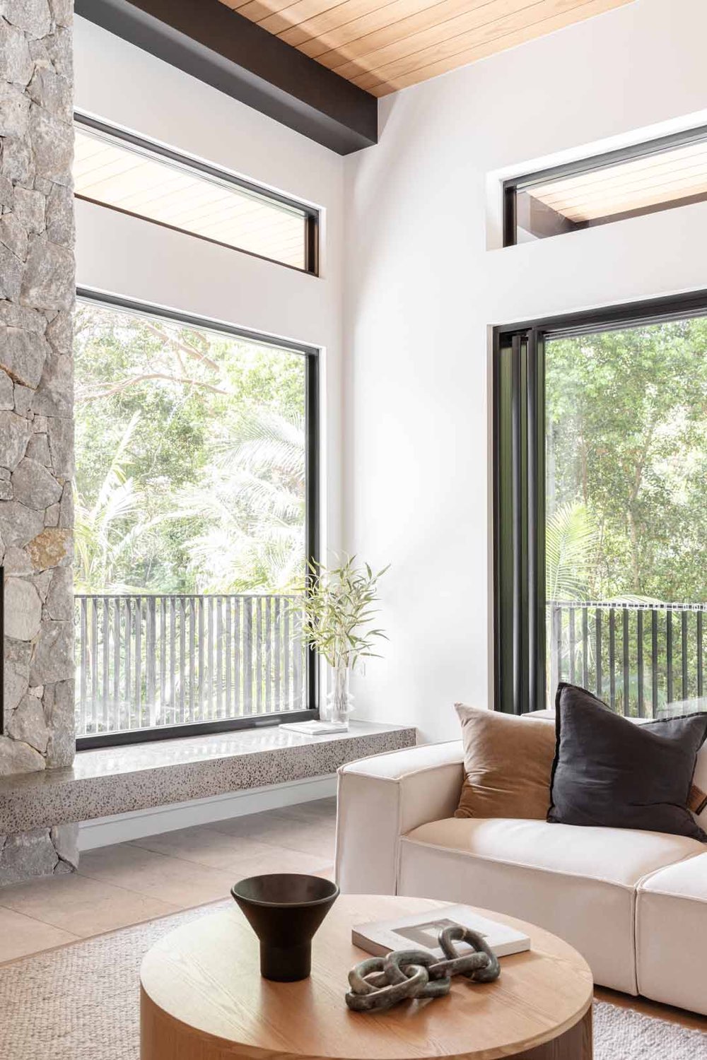 Je peux aussi vous parler des fenêtres en imposte que l'on voit dans l'espace de vie, ces fenêtres qui se trouvent au dessus des baies vitrées en haut du mur. Elles ne sont pas uniquement là pour faire entrer un peu plus la lumière à l'intérieur. Elles soulignent aussi la hauteur du mur pour mettre en évident les volumes, accentuer le sentiment d'espace.
