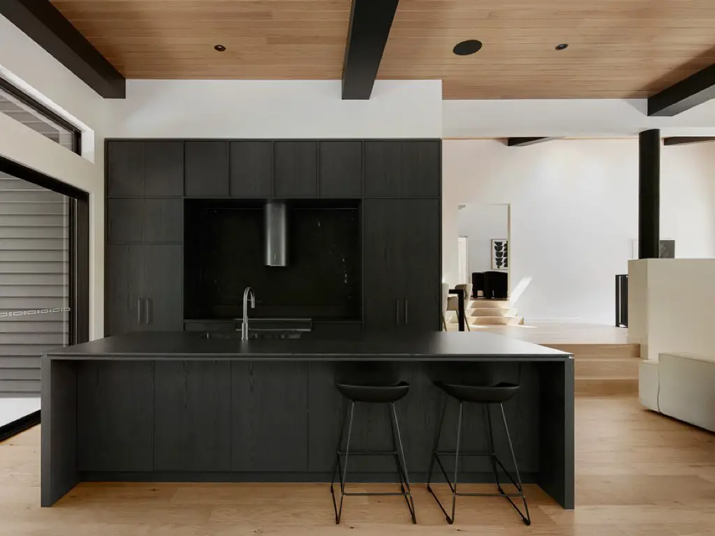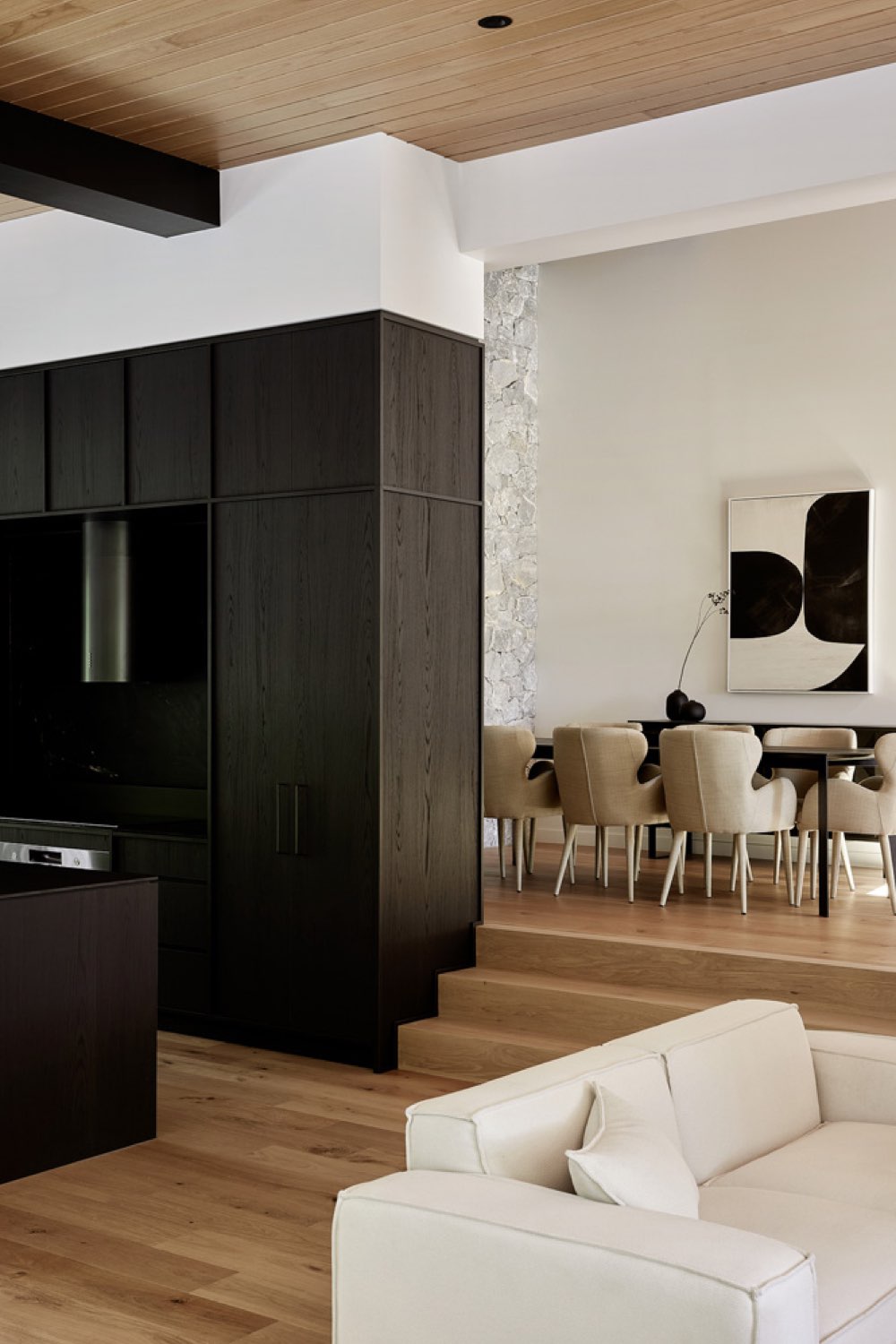Commençons à regarder cet intérieur exceptionnel avec ce qui saute aux yeux: les matériaux et couleurs. L'ensemble de cette demeure a un fil conducteur: du bois, de la pierre, du blanc et du noir. Le bois, notamment dans les espaces à vivre se trouve au sol et au plafond, cette disposition crée un effet enveloppant qui conforte l'idée de chaleur véhiculée par le bois naturel et lumineux. Le bois est aussi présent dans la cuisine mais il est teinté en noir. Les veines se voient en ton sur ton et apportent une autre dimension, un côté subtile et plus dynamique au mobilier de la cuisine ouverte.
