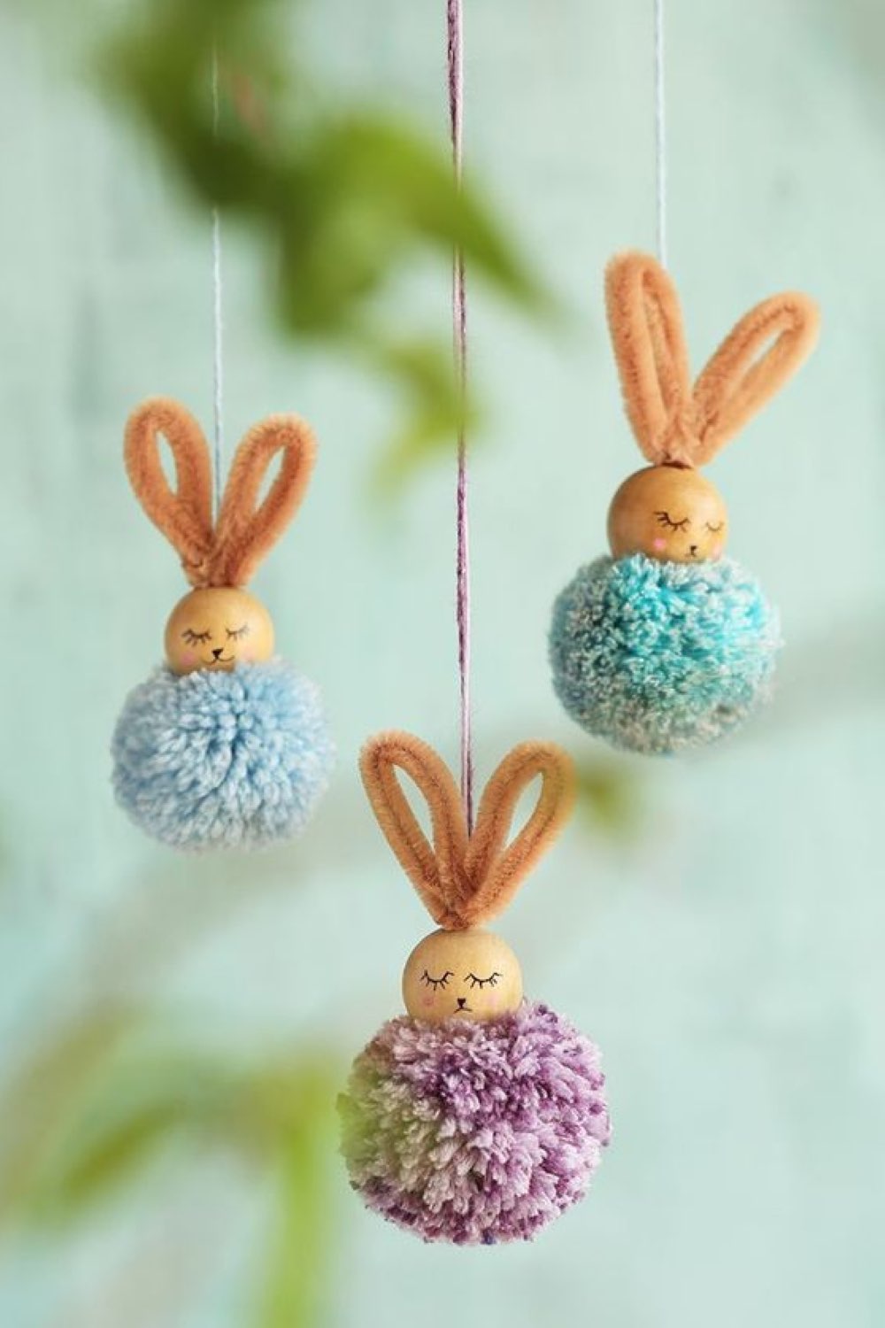 Etape 2: confectionnez autant de pompons que de silhouette de lapins. Collez les pompons à l'aide d'un pistolet à colle.