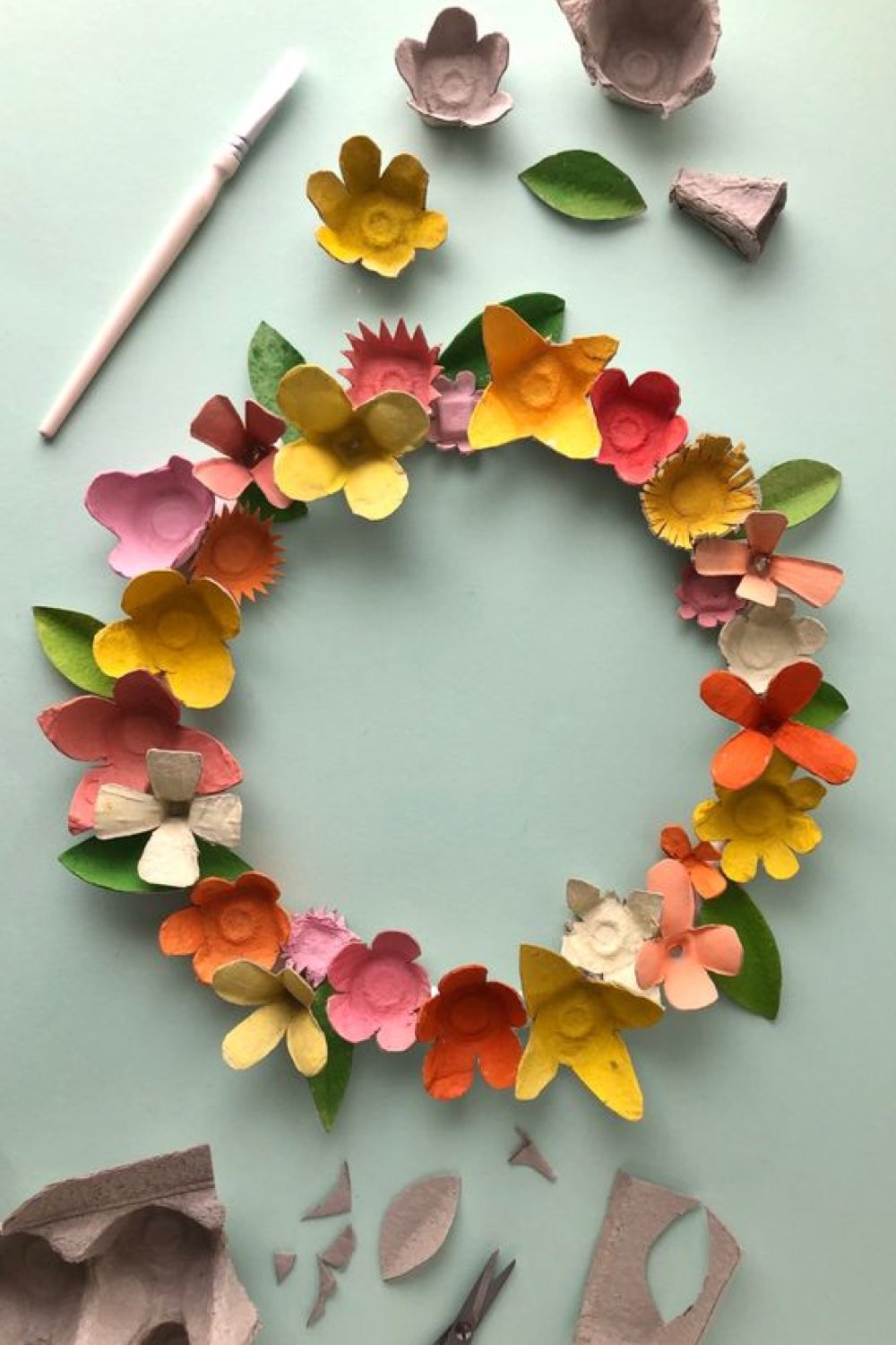 Etape 2: dans les chutes de carton et dans des boites d'oeufs, découpez des fleurs et des feuilles.
