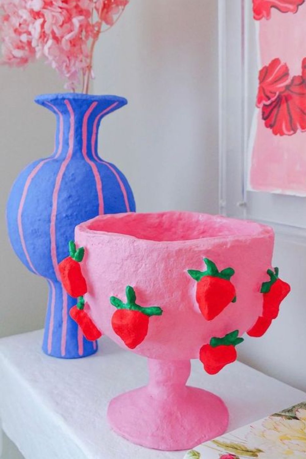 Je vous ai déjà parlé du papier mâché à plusieurs reprises. Une première fois dans la catégorie loisirs créatifs, une seconde fois dans la catégorie slow living / minimaliste. Cette année, le papier mâché ne disparait pas complètement de nos intérieurs mais il devient source de couleurs et pourquoi pas d'amusement. Comme c'est quelque chose que l'on fait soi-même, on peut donner libre cours à sa créativité. Vase, poterie, objet déco... on peut créer un tas de décoration avec du papier mâché et y ajouter une touche plus fun et dans l'air du temps grâce à des détails surprenants ou encore de la couleur. J'aime spécialement les créations en papier mâché rose et bleu électrique!