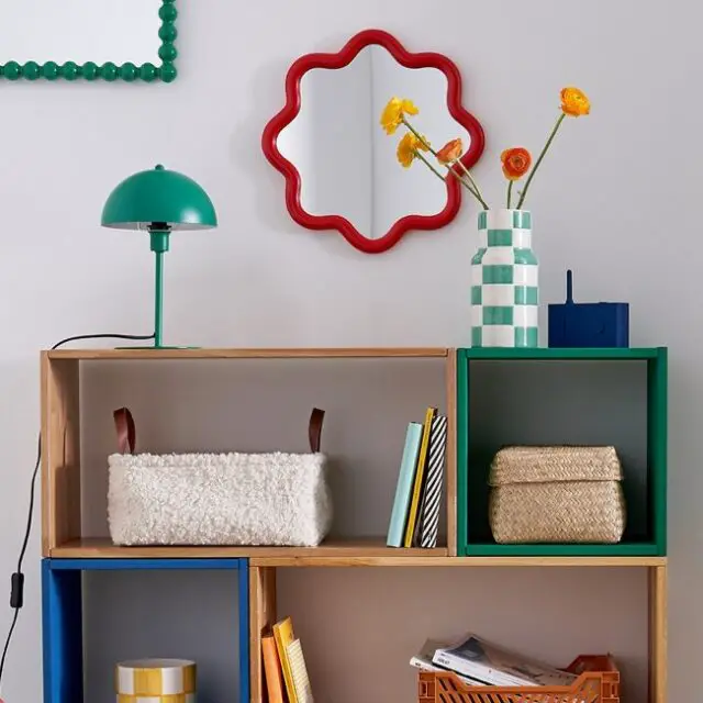 - les accessoires déco: un miroir avec un encadrement coloré, un cadre coloré, une lampe à poser...