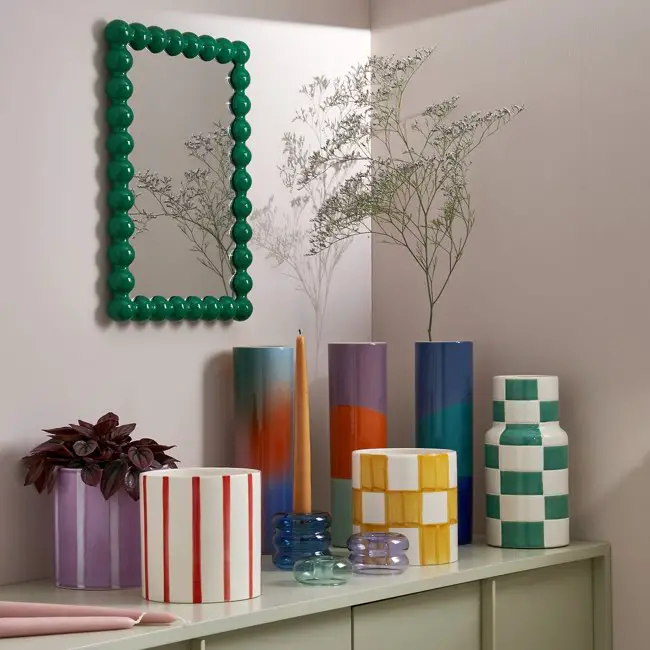 J'ai commencé cet article avec un motif, en voici un second: le damier. Ca reprend aussi le côté graphique du carrelage blanc avec des joints colorés. On est dans la géométrie et la couleur avec une touche rétro vintage. Et encore une fois, il n'y a pas besoin de faire de gros travaux pour l'intégrer dans sa déco. Vases, bougeoirs, linge de lit, tapis et j'en passe! Ce motif apportera à votre intérieur une touche de couleur graphique.