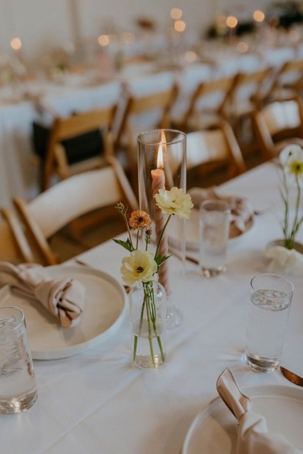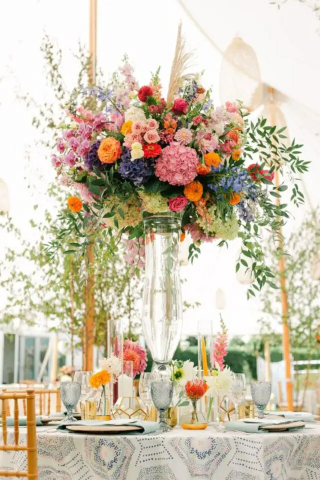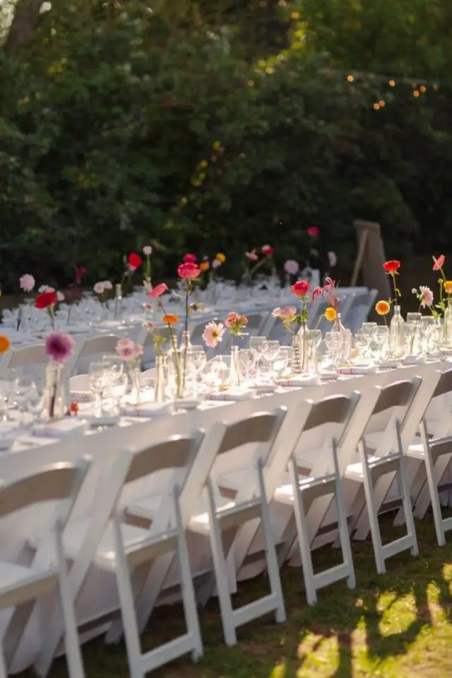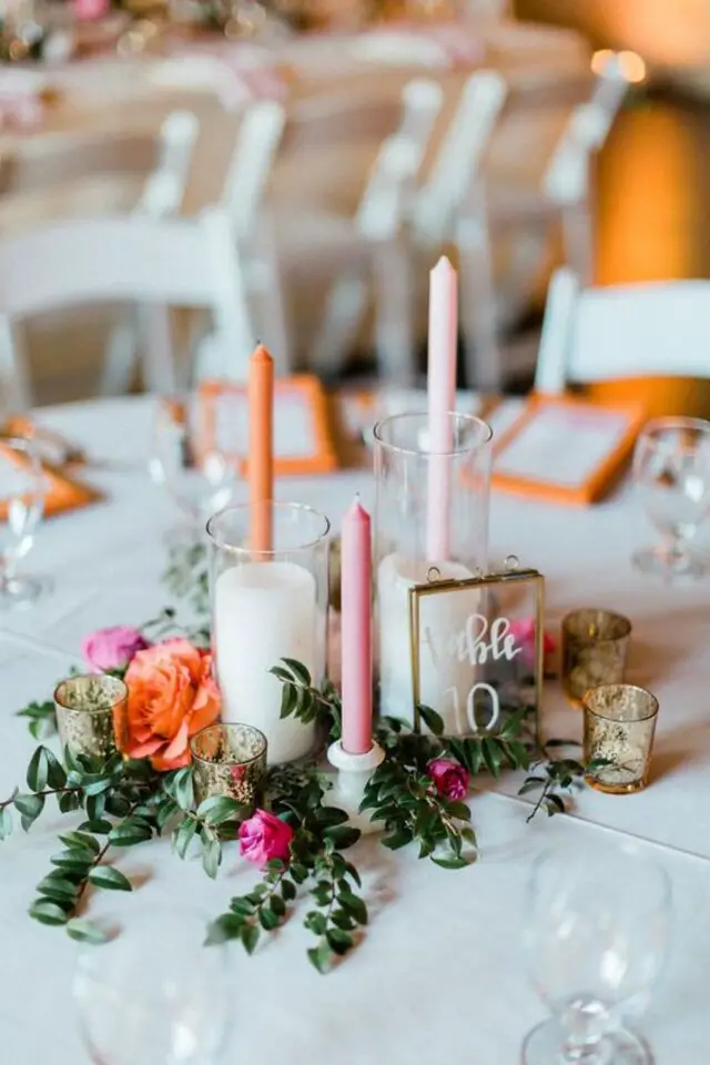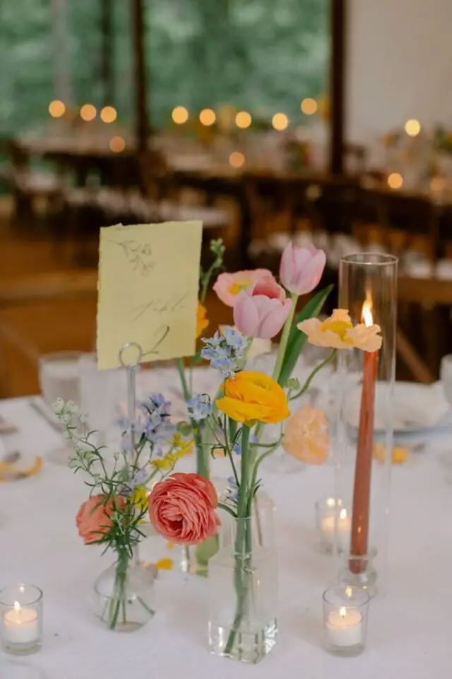 30 • Bougies et fleurs colorées pour une table de mariage en toute simplicité