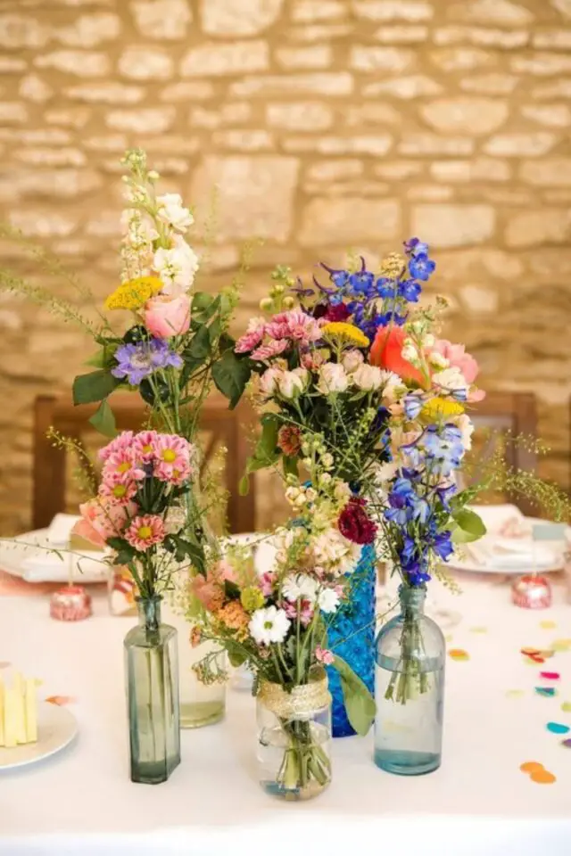 23 • Dépareiller les centres de tables - différentes fleurs de printemps, différents vases