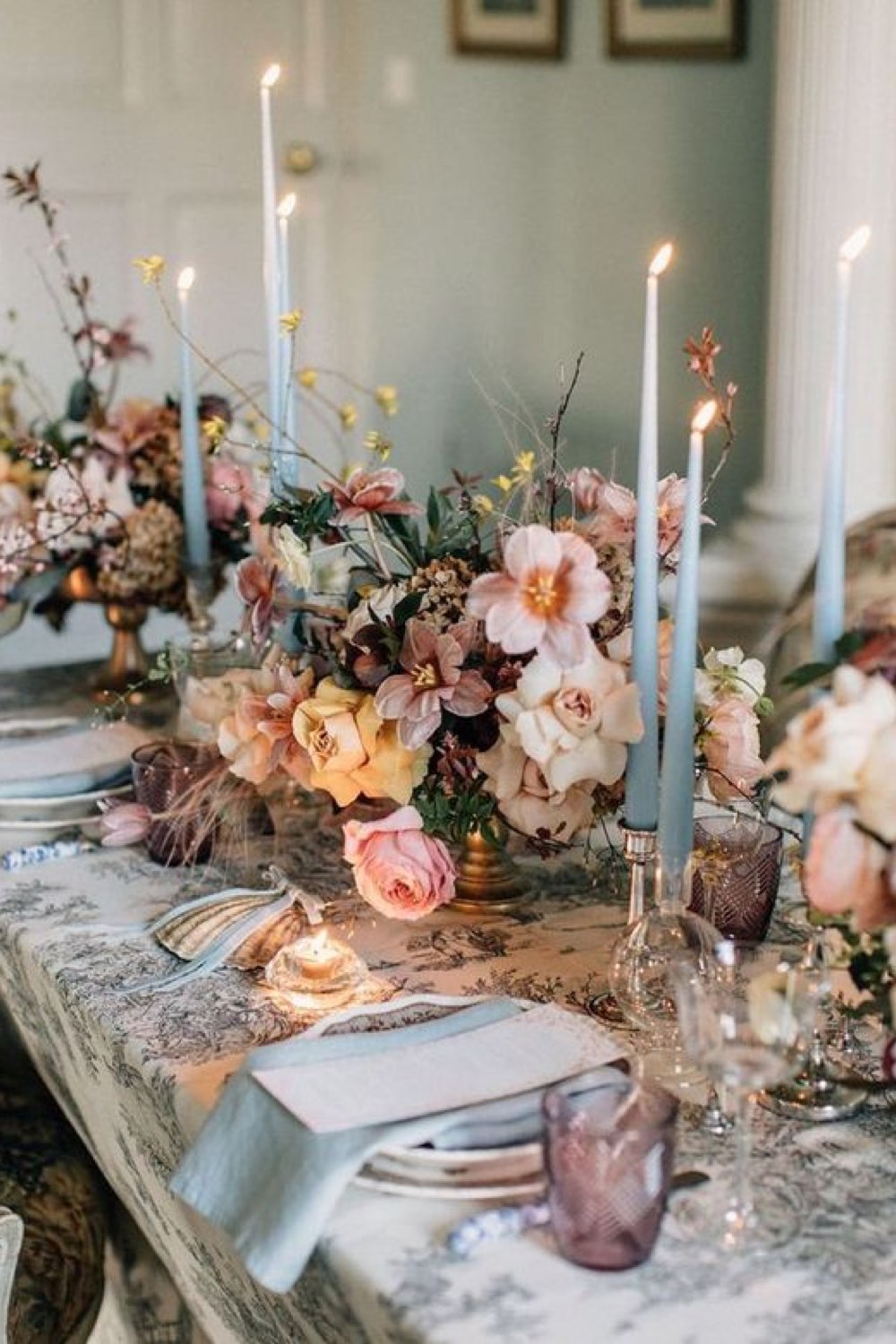 28 • Un chemin de table composé de bouquet de fleurs et de bougies colorées