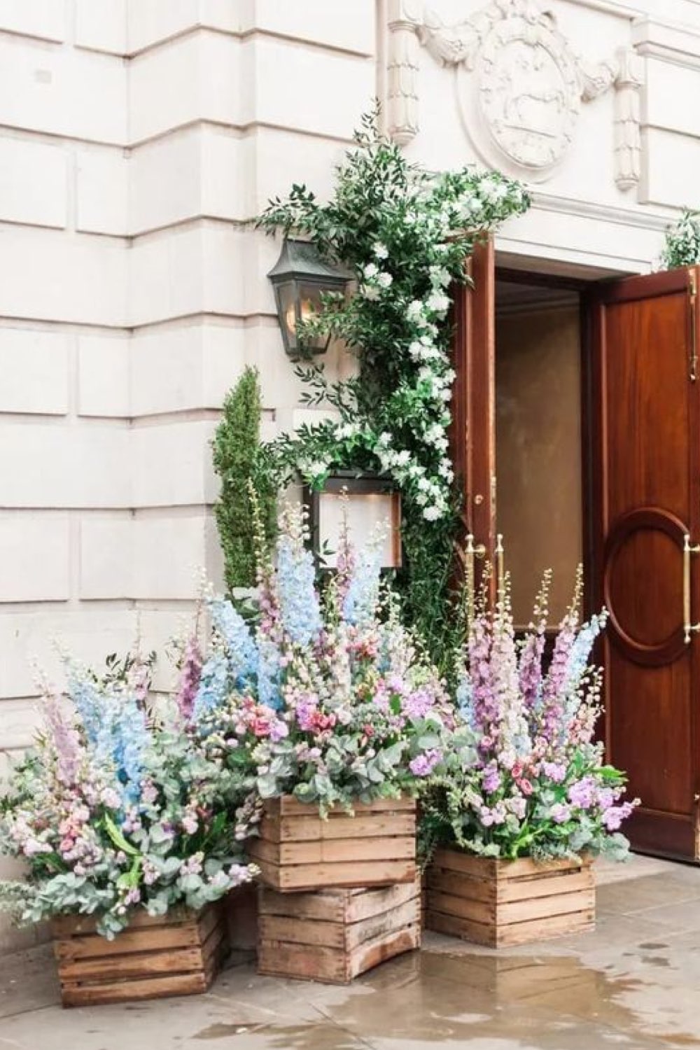 14 • Des bouquets de fleurs dans des cagettes en bois pour l'entrée de la salle de réception