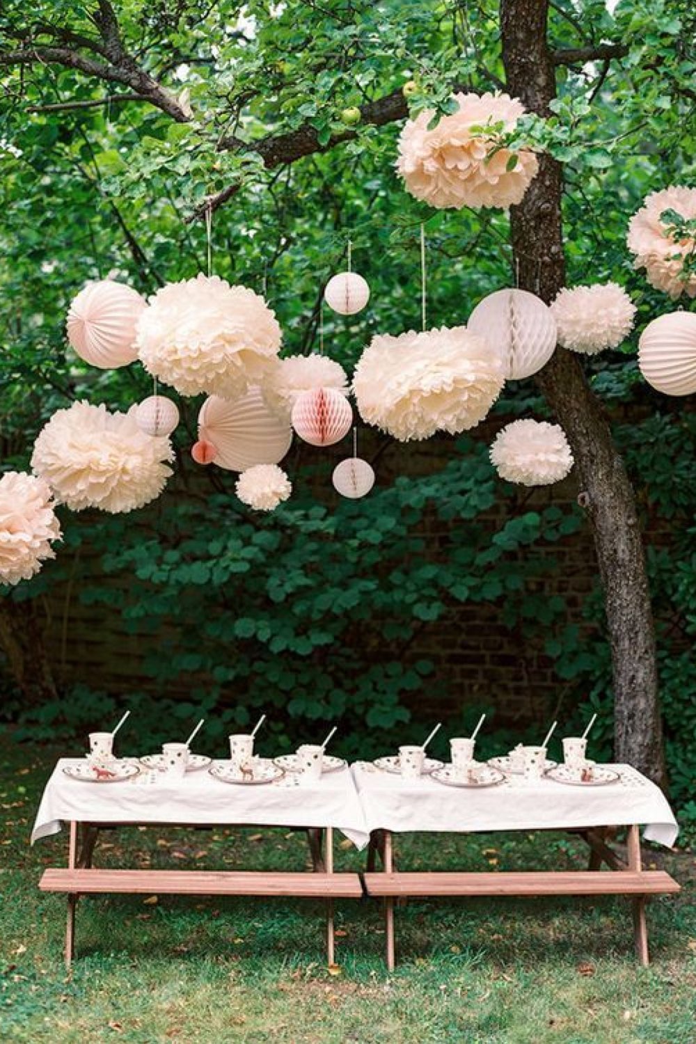 16 • Mariage en extérieur - suspensions en papier accrochées au dessus de la table