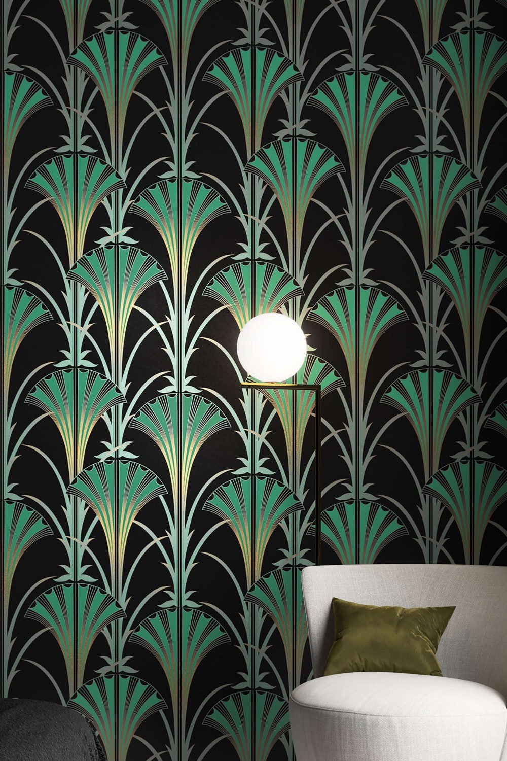 Que ce soit dans le mobilier ou dans le choix des motifs, l'Art Déco se caractérise par une certaine forme de symétrie. La symétrie ne signifie pas nécessairement des formes anguleuses, j'y reviens après. On peut avoir une symétrie qui soit douce. Le moyen le plus facile d'arriver à faire écho à cette idée de symétrie est sans doute le papier peint (ou les décors muraux). Plus discret, on peut aussi compter sur les textiles. Je pense par exemple aux housses de coussins qui peuvent se parer de motifs symétriques qui font référence à l'Art Déco.