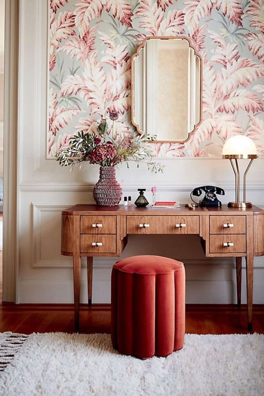 Comment intégrer le laiton dans sa déco? Il y a plusieurs manières d'utiliser ce matériau / cette couleur or. Tout dépend de la proportion de doré que vous souhaitez intégrer chez vous. On peut très bien choisir un miroir avec un encadrement doré (si possible qui reprend les formes typiques de l'Art Déco). Toujours avec subtilité, certains motifs de papiers peints intègrent le doré facilement.