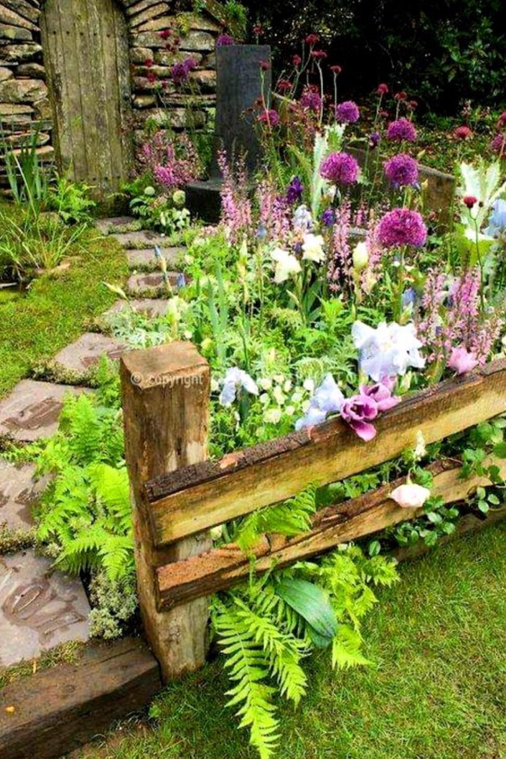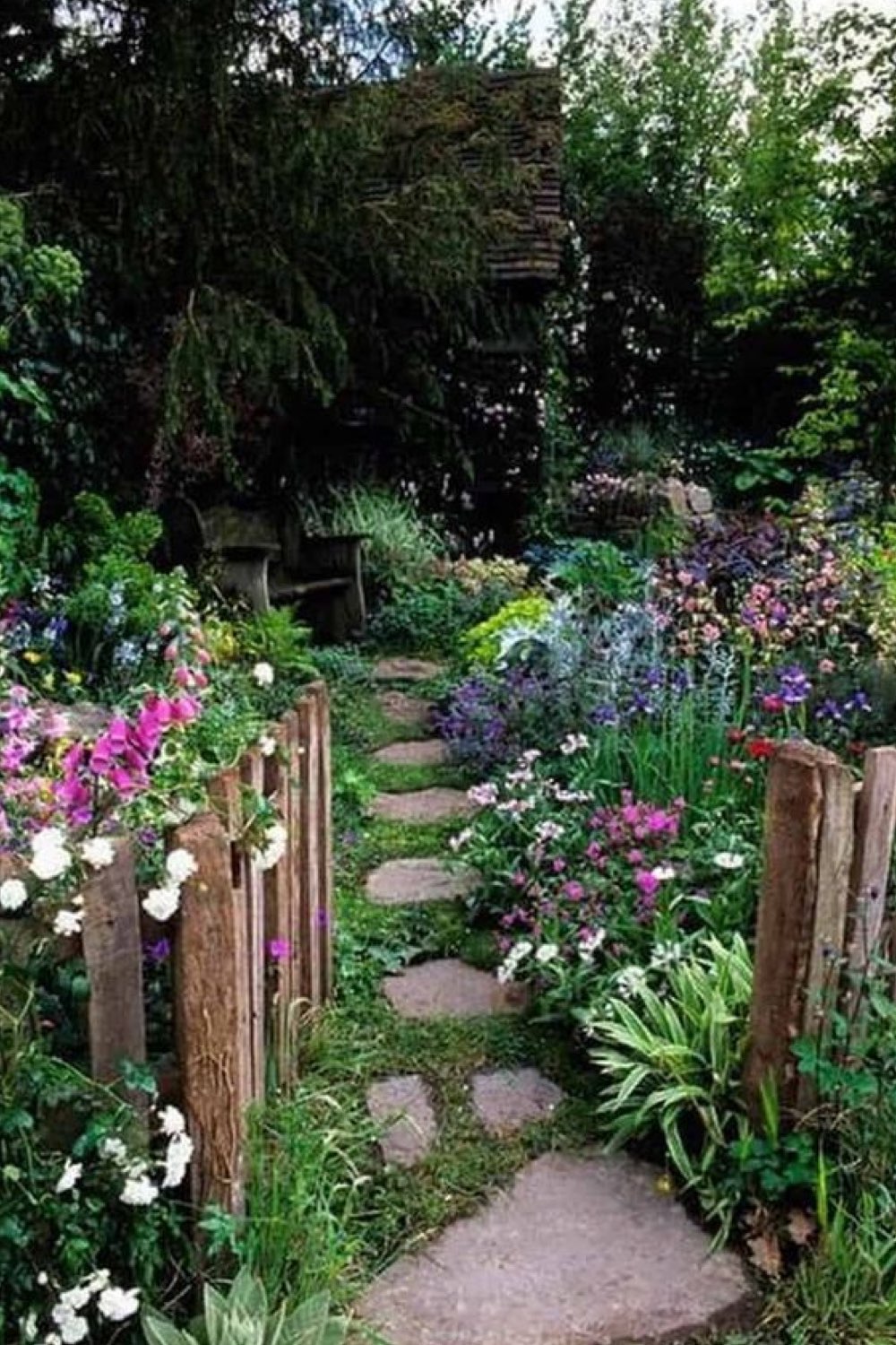 On reste dans l'idée de contemplation qui permet de profiter du jardin avec un banc excentré, placé à l'ombre d'un arbre et auquel on accède grâce à une petite allée bordée de fleurs et de plantes. Au départ, avant de commencer cet article, j'imaginais les jardins rustiques un peu ternes. La réalité est toute autre grâce à la nature qui prend ses aises et aux fleurs qui apportent de la gaité.