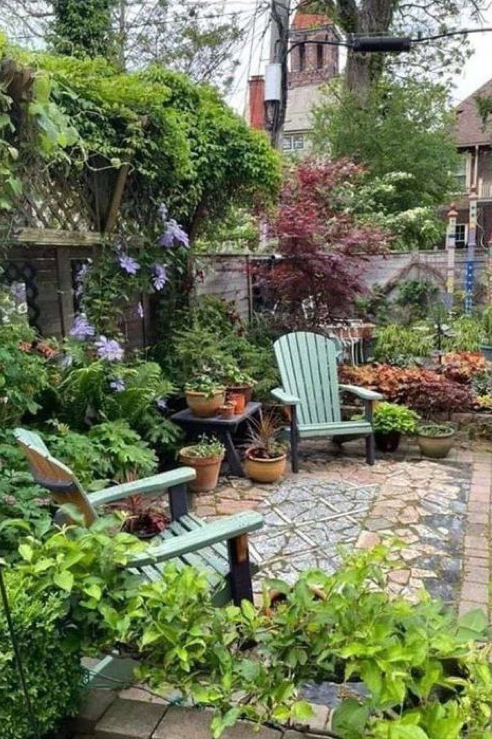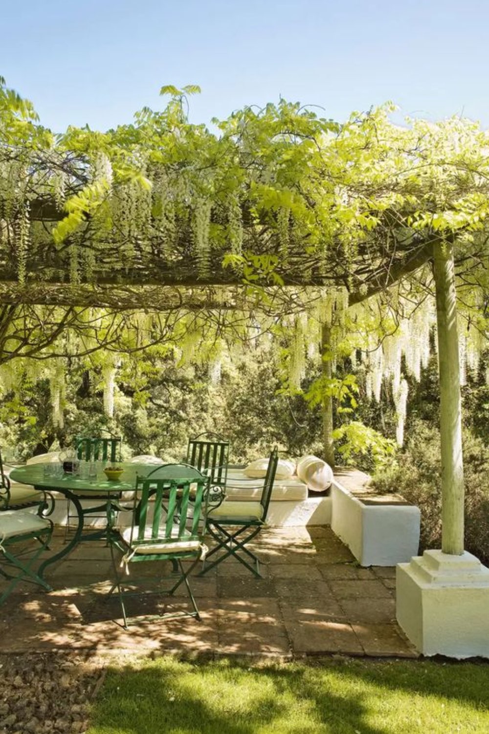 29 • Un salon de jardin en métal vert (sous une pergola verdoyante)