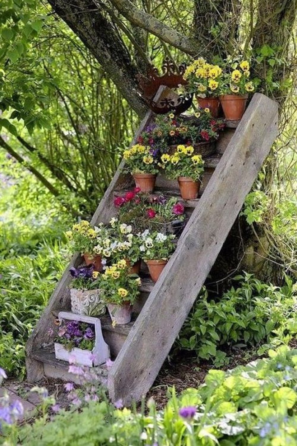 Dans le même esprit que l'échelle en bois au tout début de cet article, c'est un ancien escalier qui a été coupé et scellé sur un arbre pour créer des étagères qui permettent de fleurir un espace qui n'est généralement pas aménagé. Si vous avez rénové un corps de ferme, c'est même possible que vous ayez gardé le vieil escalier qui menait aux combles. C'est une jolie manière de lui offrir une nouvelle vie.