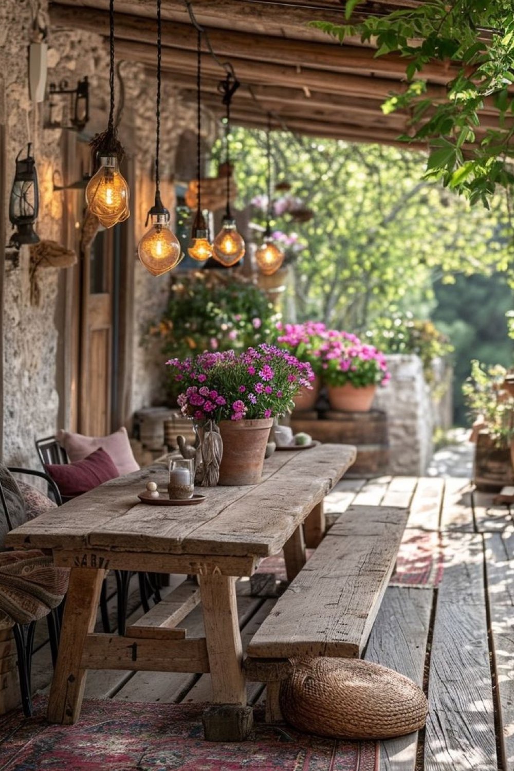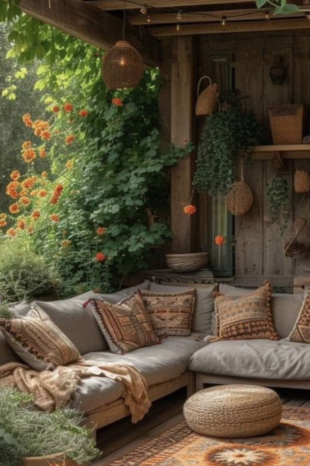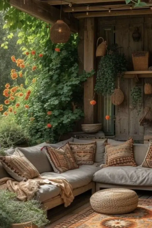 15 • Canapé cosy et étagères en bois sous une pergola rustique