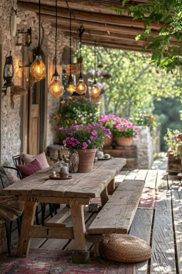 Comme ici il est question d'un jardin rustique, on oublie les éclairages trop modernes. On peut par exemple partir sur des lanternes et des bougies pour une ambiance douce et naturelle. Et certains éléments de votre déco intérieure peuvent trouver leur place aussi en extérieur le temps de l'été.