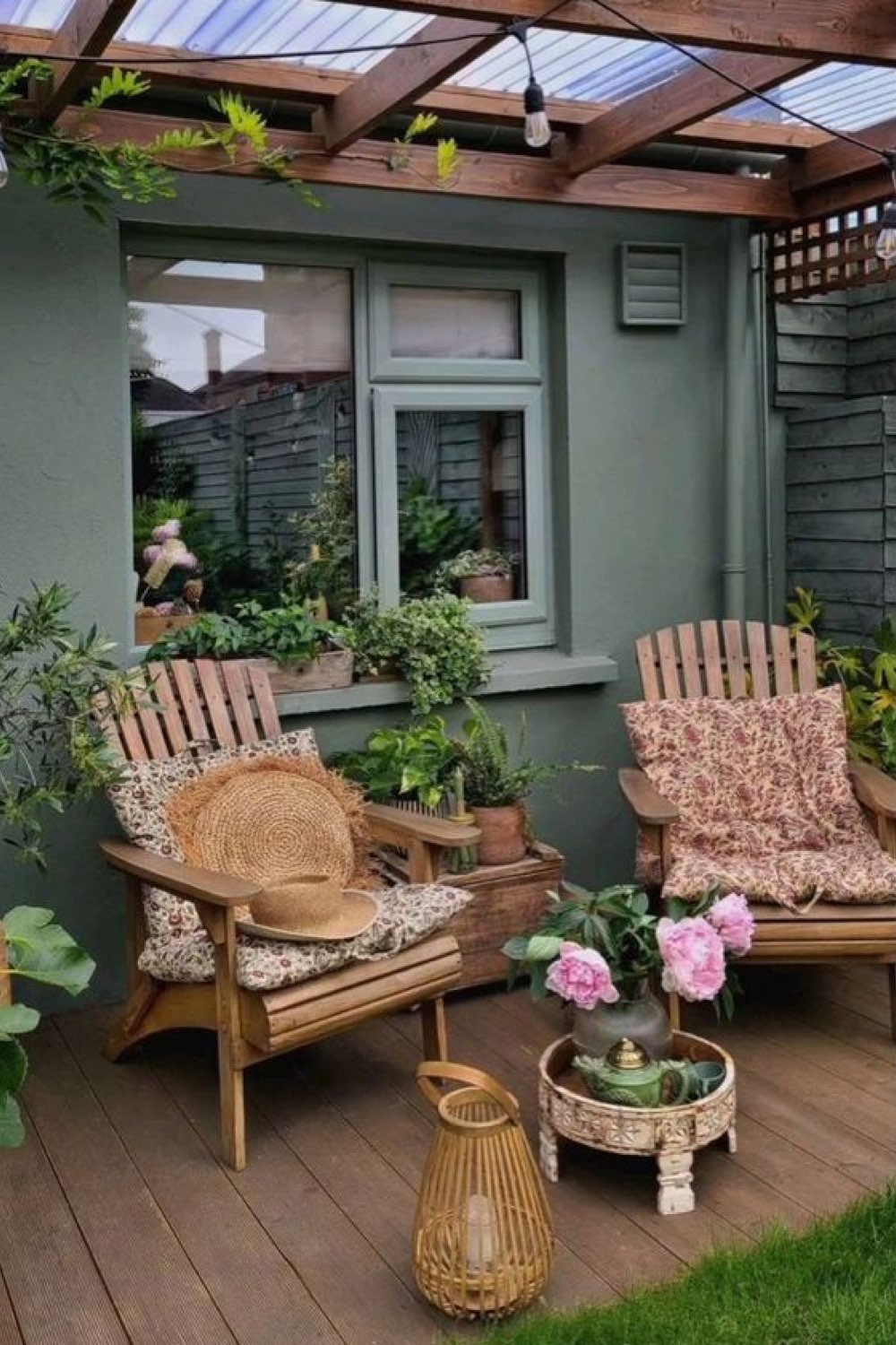 Cette inspiration est un de mes coups de coeur dans cet article. J'aime le vert kaki de la façade, j'aime la petite avancée en bois qui fait office de terrasse, j'aime les fauteuils en bois. J'aime aussi particulièrement la pergola couverte qui permet de profiter de l'extérieur tranquillement même quand le temps ne s'y prête pas. Couleur + petit espace naturel + la possibilité de contempler la nature = pour moi c'est un combo gagnant!