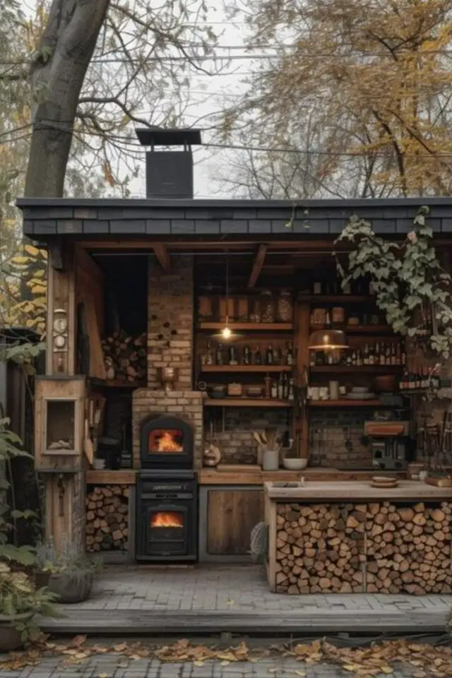 On passe à un aménagement plus conséquent mais que j'affectionne beaucoup: la cuisine extérieure. Plus tôt dans cet article, je vous ai proposé une cuisine en palette mais j'avais envie de vous montrer qu'il y a des espaces bien plus confortables et durables - même dans un esprit rustique. Les matériaux y sont pour beaucoup: de la brique, du bois, de l'ardoise. Des matériaux simples et robustes. On ajoute une réserve de bois pour alimenter les fours et il n'y a pas besoin de beaucoup plus pour que la cuisine outdoor s'intègre dans un jardin campagne.