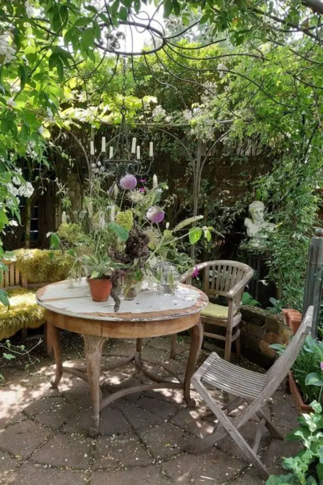 28 • Un kiosque en métal verdoyant avec des meubles de brocante