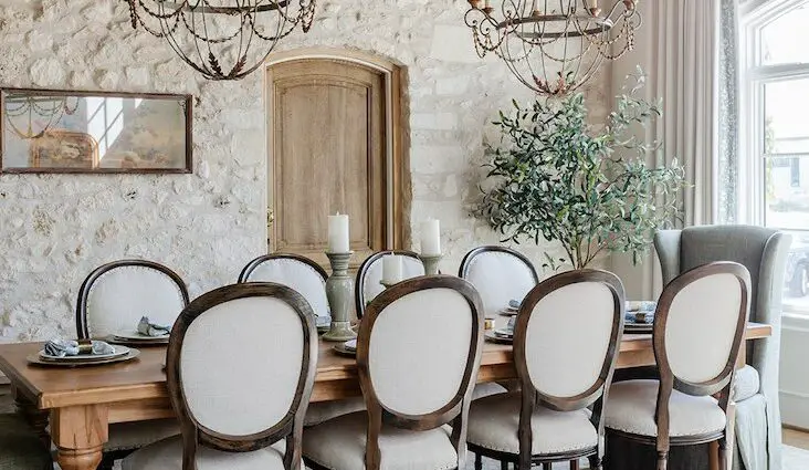 Et puis, il y a la salle à manger. Une pièce à part entière avec un décor travaillé et chic. Au mur, de vieilles pierres couleur calcaire qui donnent beaucoup de charme à l'espace. Une grande table en bois familiale et robuste. Des chaises dans un style shabby chic associant armature en bois et tissu écru. Et au dessus, trône un lustre en métal grand format mais pas ostentatoire. On retrouve ici cette idée de charme naturel sans en faire des caisses.
