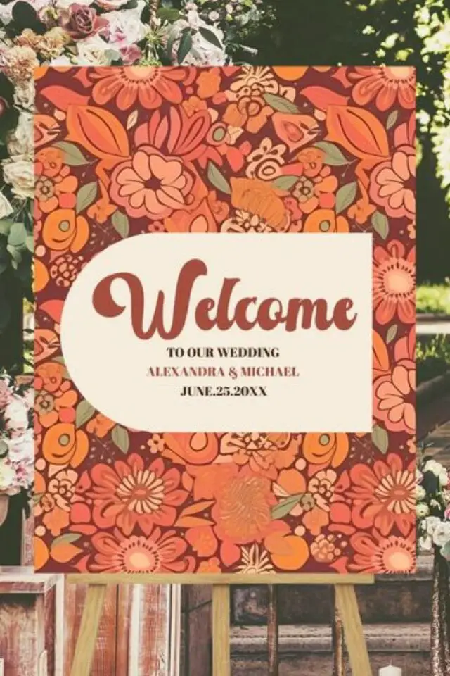 1/10 • Un panneau de bienvenue floral dans des tons orange, marrons et rose