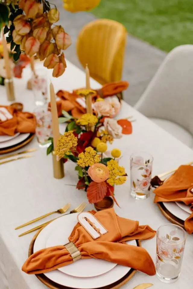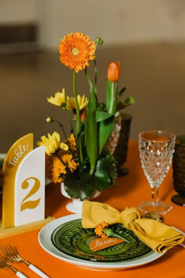 2/10 • Une déco de table orange et jaune pour un mariage rétro