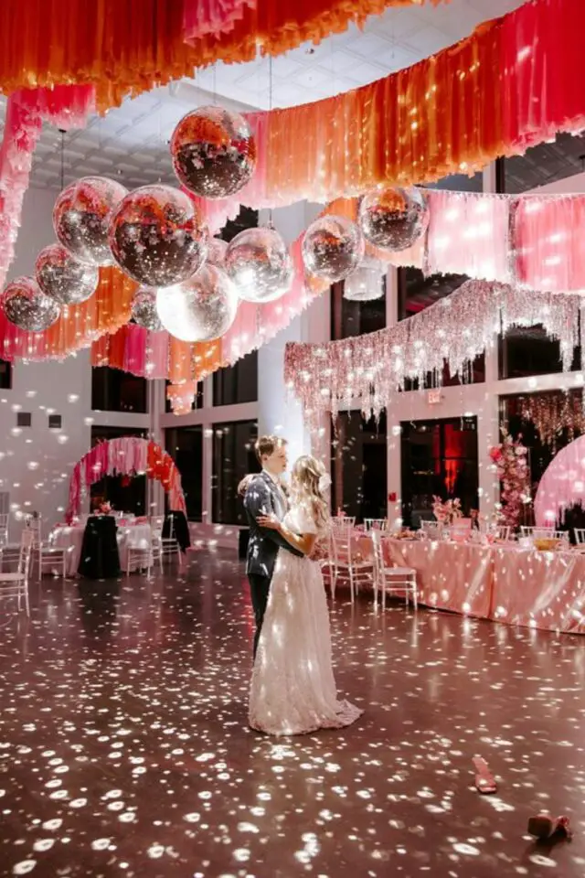 3/10 • Décorer le plafond de la piste de danse avec des boules à facettes & des couleurs disco