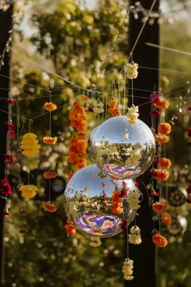 6/10 • Suspendre des fleurs colorées et une boule à facettes pour créer une piste de danse en extérieur
