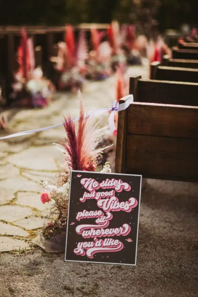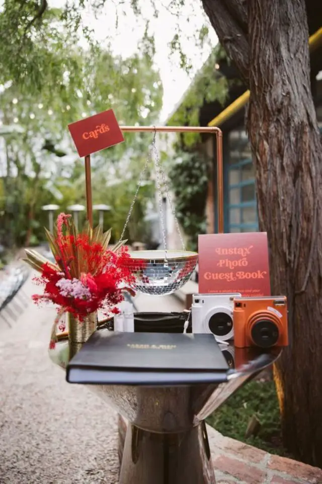 On est loin du mariage vert et blanc champêtre ici. Le thème groovy / disco a des couleurs facilement identifiables qui correspondent à notre imaginaire des années 70 / 80. On va trouver du orange sous différentes nuances, une touche de marron. On a le rouge, le jaune qui sont de la partie. Le rose ou encore le parme ne sont pas exclus. Je l'écris souvent quand je parle de déco intérieure, la couleur met de bonne humeur. C'est aussi valable pour la déco de mariage. Ces couleurs, on les retrouve partout: panneau de bienvenue à l'entrée de la salle, bouquets sur les tables, vaisselle, photobooth...