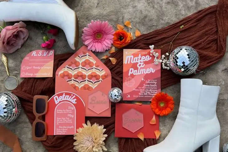 Typo et couleurs sorties tout droit des années 70, un clin d'oeil rapide au psychédélique de l'époque hippie avec des couleurs chaudes et amusantes. Dès le moment où vous invitez vos proches à votre union, vous leur promettez un moment inoubliable. C'est aussi la promesse de passer un bon moment rempli de joie (avec une grosse touche d'amusement!)