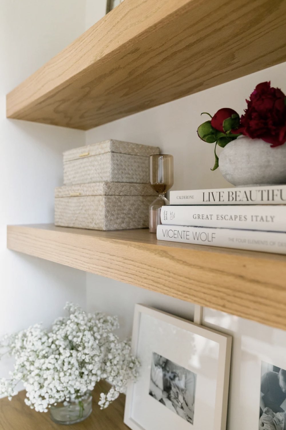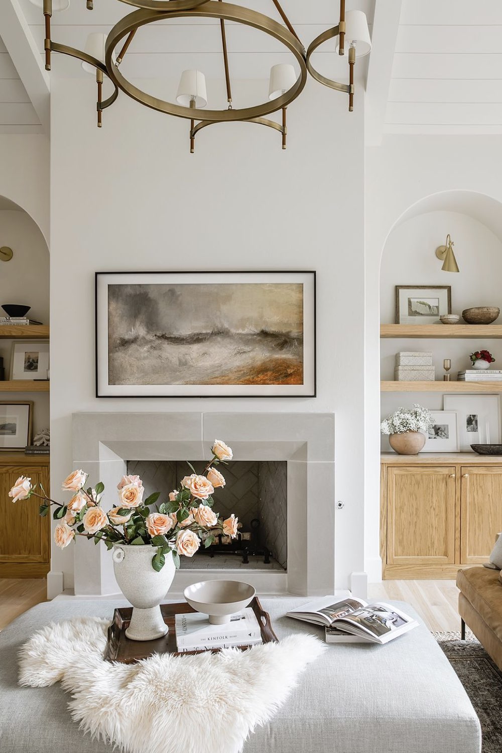 Cette cheminée est encadrée par deux bibliothèques. La symétrie est classique. Cependant, le fait qu'elles soient cintrées, blanches avec des étagères en bois clairs donne un style plus actuel au mur et à la pièce. Les placards rétablissent l'équilibre puisqu'ils sont plus traditionnels.