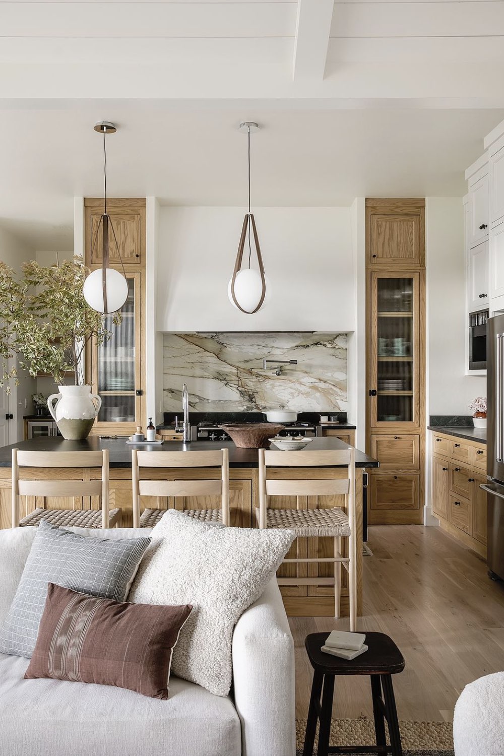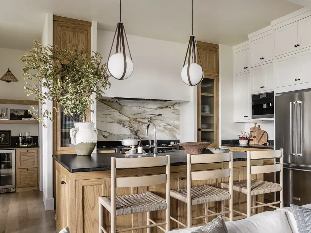 Le bois et le piano de cuisson aident à créer cette atmosphère rustique que l'on trouve partout dans la demeure. Les tabourets de bar en bois clair avec une assise tressée, les accessoires posés surs les étagères et la plan de travail font le reste. Les deux suspensions au dessus de l'îlot de cuisine sont aussi assez rustique mais chic avec leur globe blanc et le système d'attache peu commun.