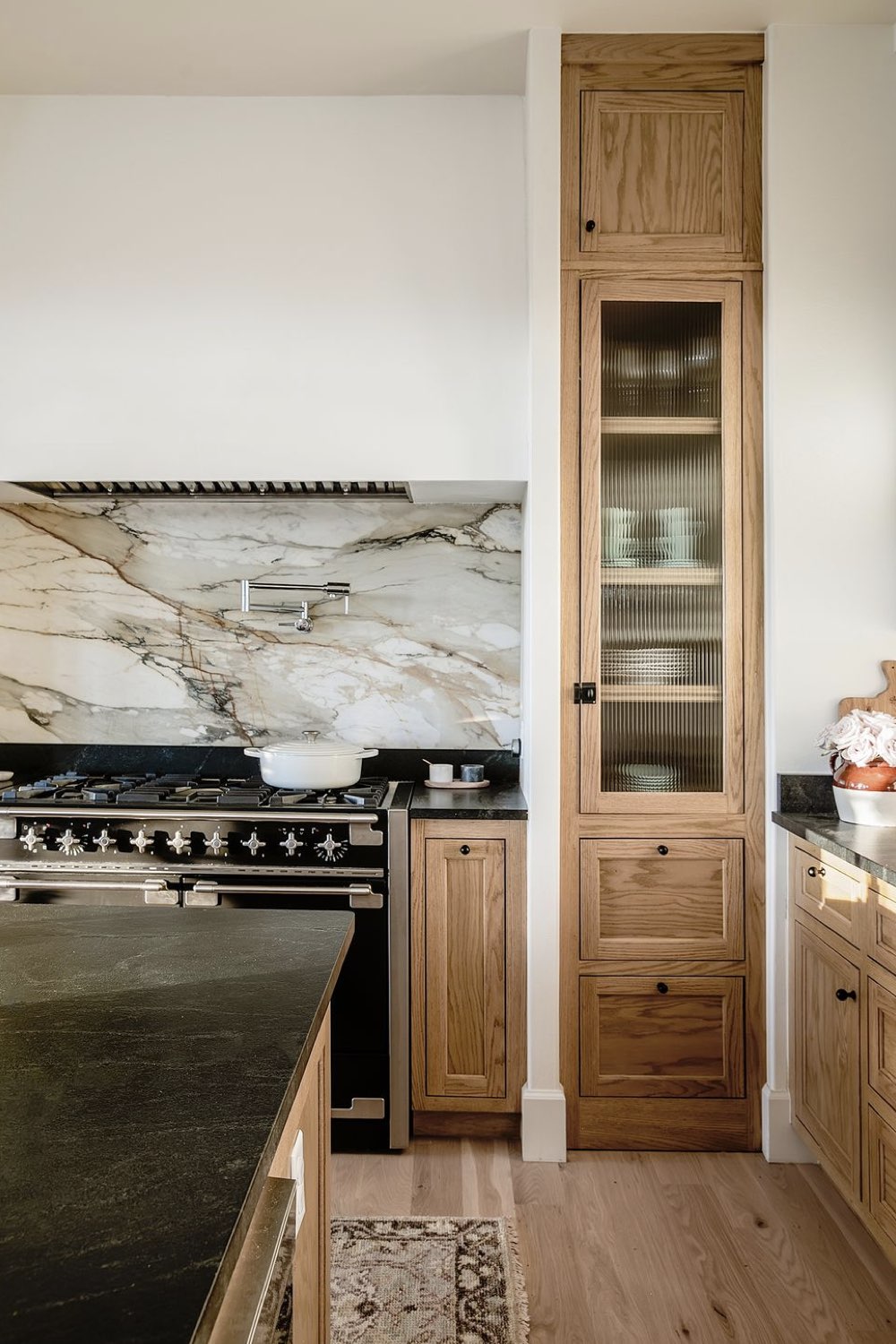 Toujours dans cette grande pièce de vie, on trouve la cuisine. J'aime beaucoup l'effet d'encadrement créé par les deux colonnes en bois vitrées pour mettre en valeur le piano de cuisson, la crédence marbrée et la hotte invisible coffrée en blanc sans aucun artifice.