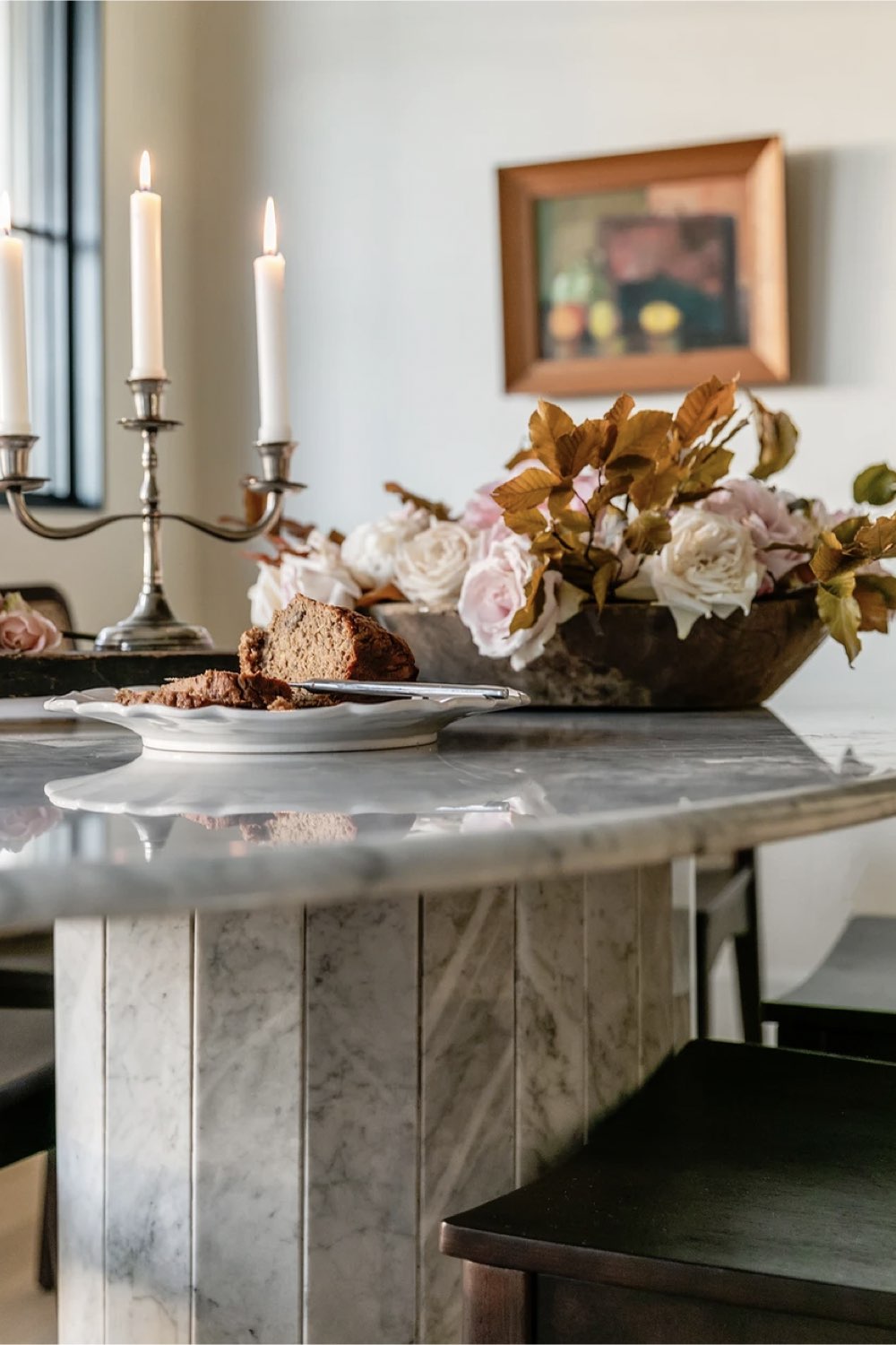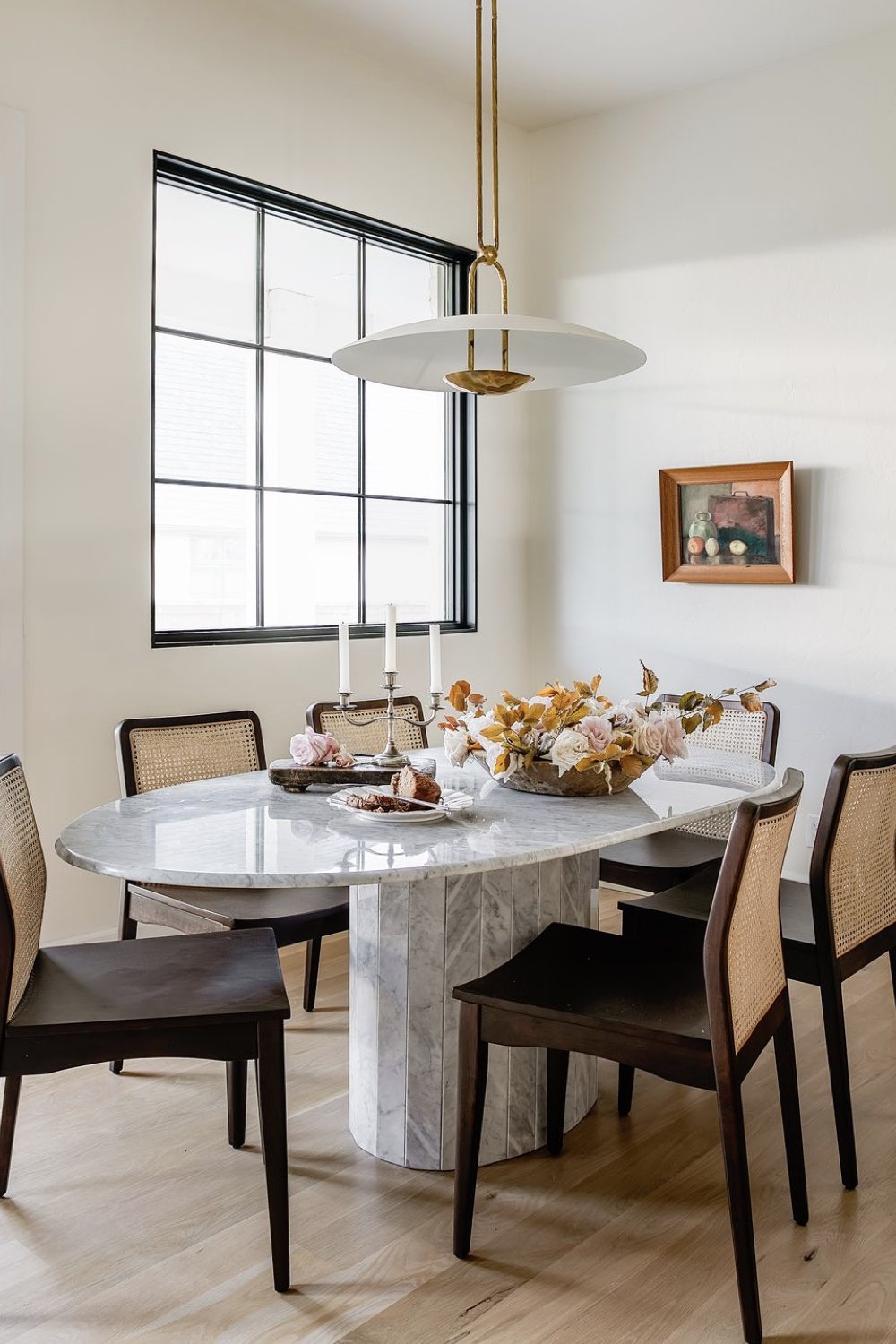 Cette absence d'artifice donne une importance unique à ce qui est présent: la table oblongue en marbre gris, les chaises en cannage et bois sombre, une suspension ancienne et élégante, un tableau unique avec une nature morte encadrée.