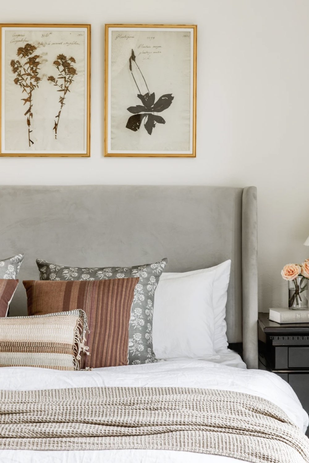 J'aime aussi dans cette chambre à coucher le décor tête de lit simple + affiches botaniques au dessus. Je suis sensible à la touche naturelle qu'apportent les affiches. C'est très simple, il y a une forme de minimalisme dans ce décor qui me parle. Cela crée une atmosphère personnelle et douce dans laquelle il doit être bon se coucher tous les soirs.