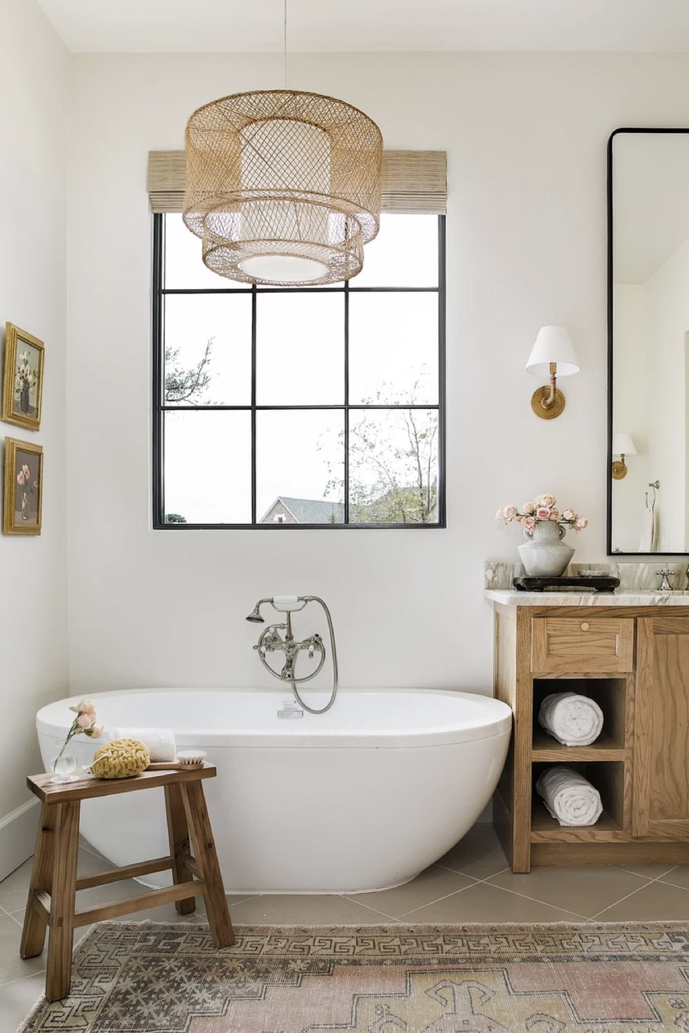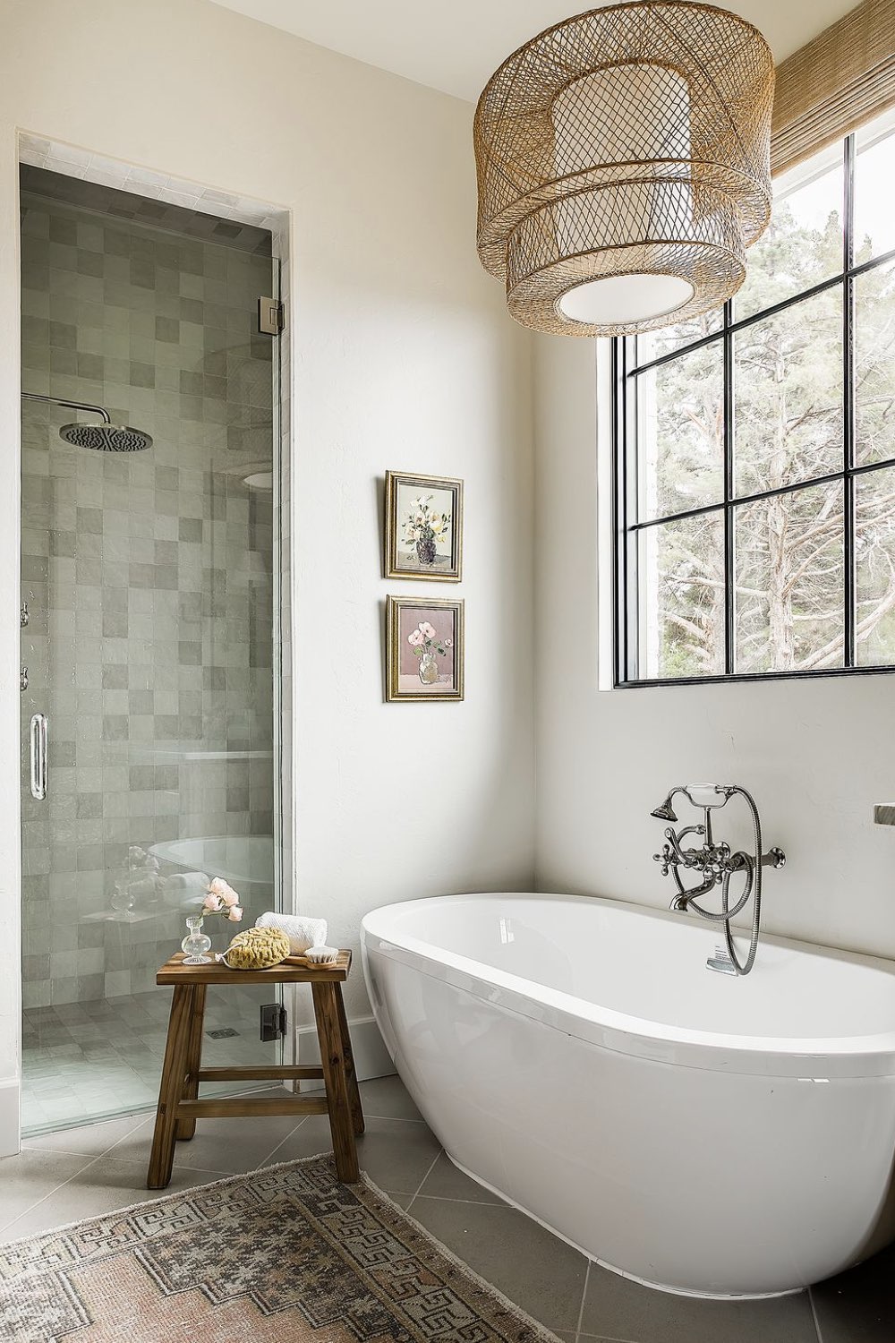 Une salle de bain avec baignoire et douche à l'esthétique classique et moderne