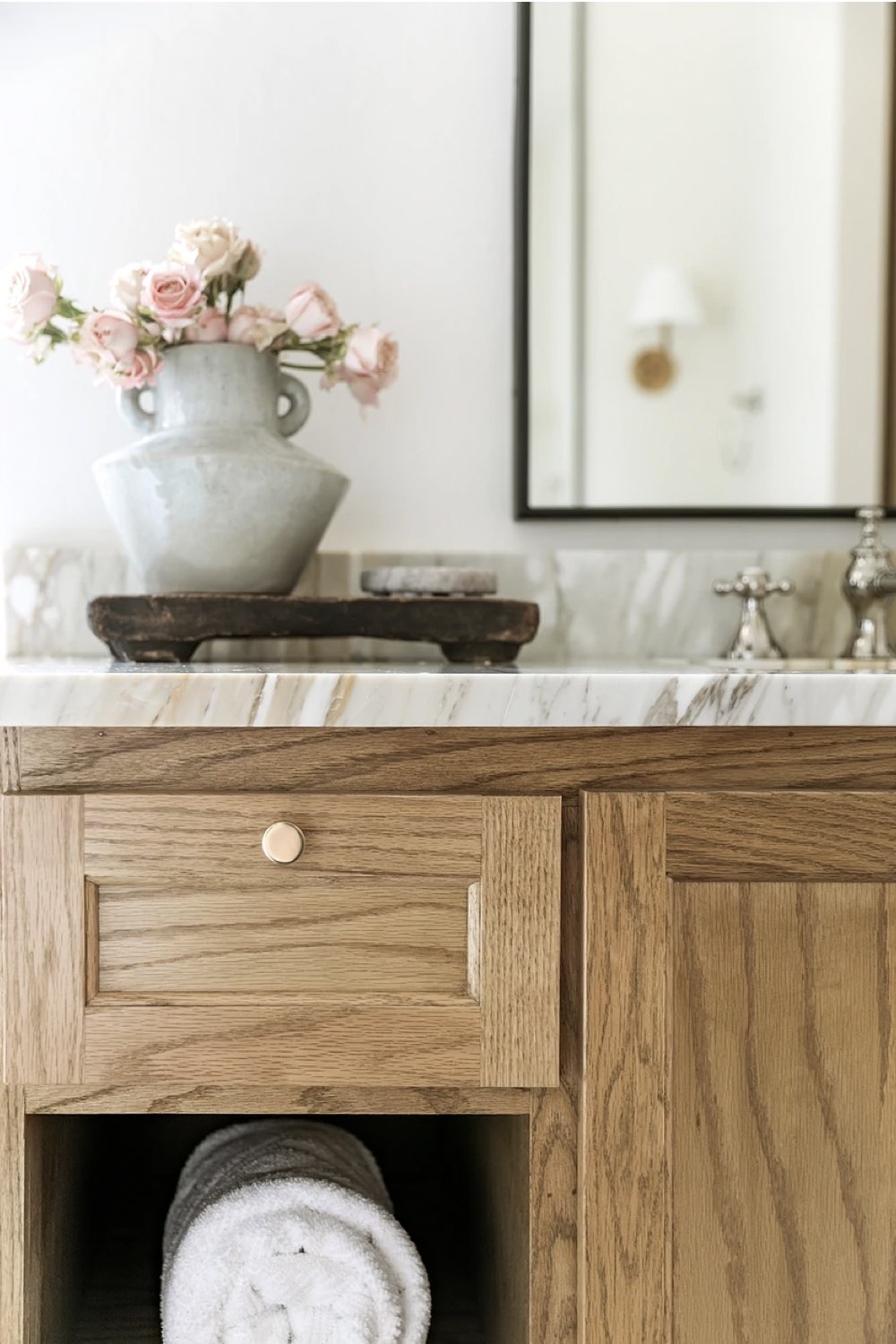 Les quelques éléments de décoration murale (cadres, appliques) sont plus classique. Le meuble vaque en bois avec un plan en marbre est dans cette lignée.