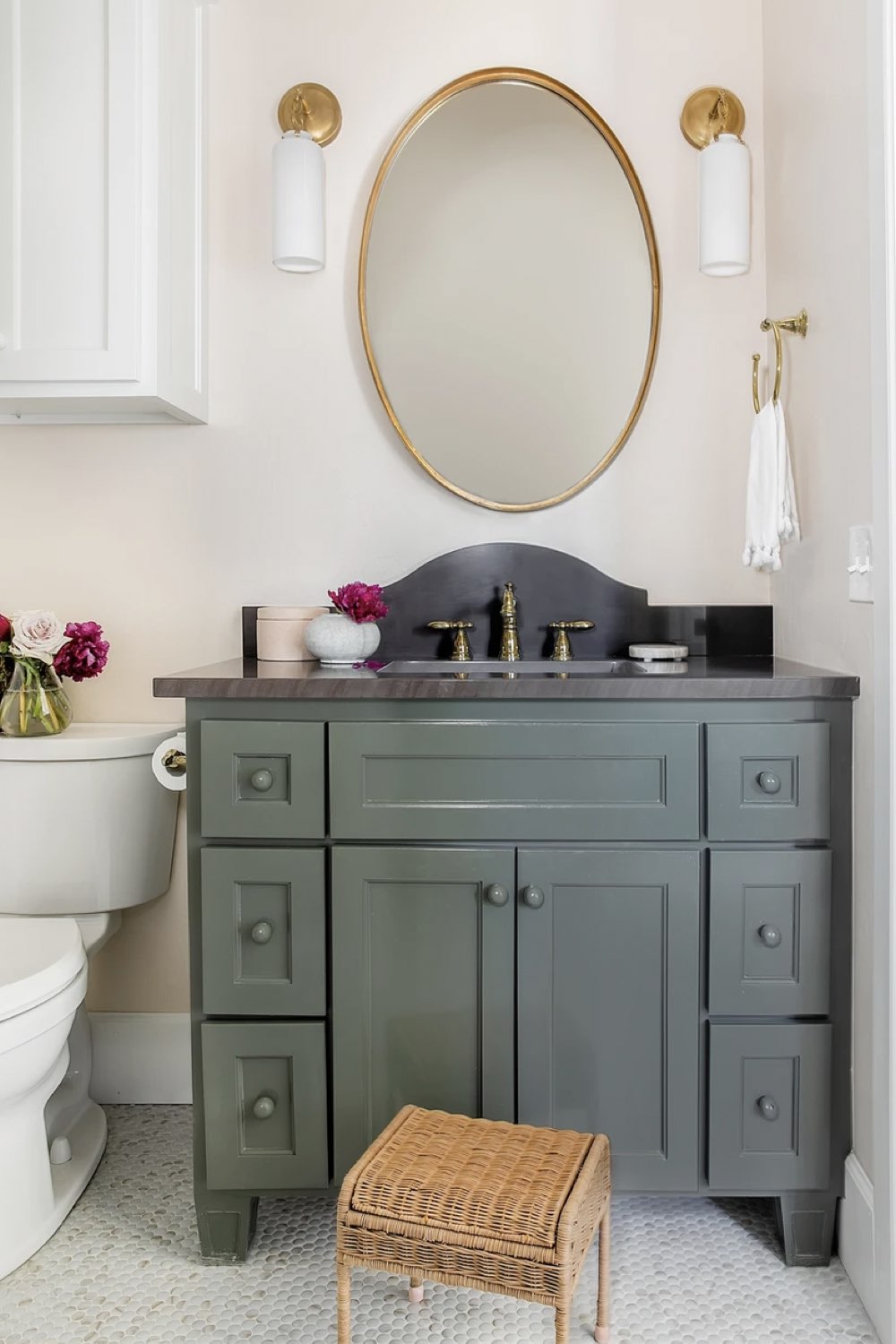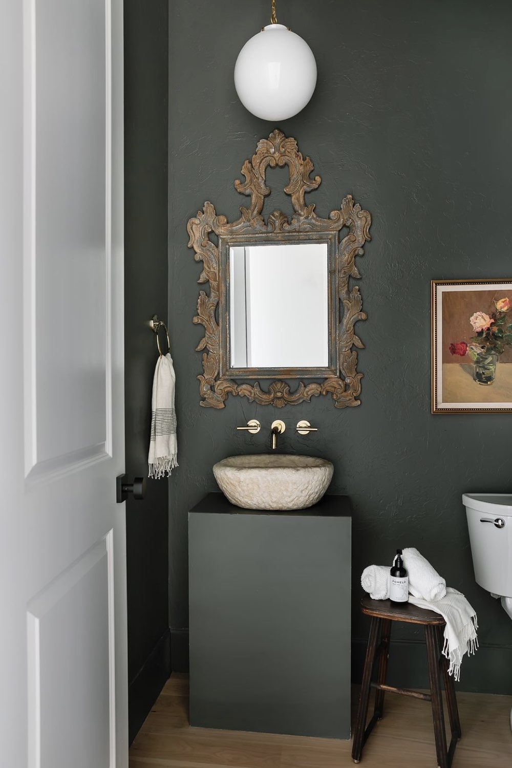 Les toilettes, c'est une des pièces j'ai l'impression que les gens préfèrent décorer. Bien souvent, c'est la pièce où on s'autorise le plus de parti-pris décoratifs. On ose dans les toilettes. Ici, je ne vais pas dire que c'est décevant, ça ne l'est pas. On retrouve l'atmosphère campagne présente ailleurs dans la maison. Cependant, l'un des deux cabinets se dénote par l'utilisation d'une couleur sourde, un gris sombre pas tout à fait anthracite.