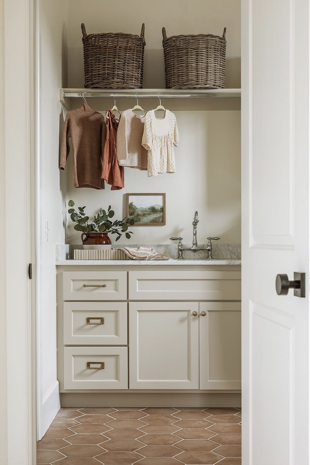 Je l'ai écrit plus haut, j'aime beaucoup ce qui a été fait de la buanderie. J'aime ce soucis du détail jusque dans les pièces qui sont normalement plus pratiques que déco. L'écru crée un espace lumineux et augmente l'impression d'espace de cette pièce toute petite (comme un grand placard).