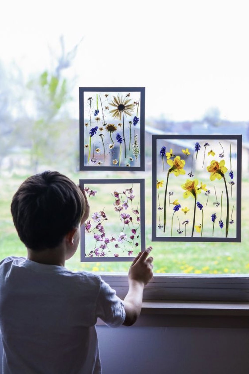 Des feuilles plastique (comme celle pour les rétro-projecteurs), du masking tape, du double-face et surtout des fleurs que vous avez faites séchées entre les pages d'un gros dictionnaire. Il n'en faut pas plus pour créer un herbier à coller sur la fenêtre. Même les jours de grisaille, votre maman aura sous les yeux des fleurs colorées! Une bonne alternative (plus durable) aux fleurs coupées.