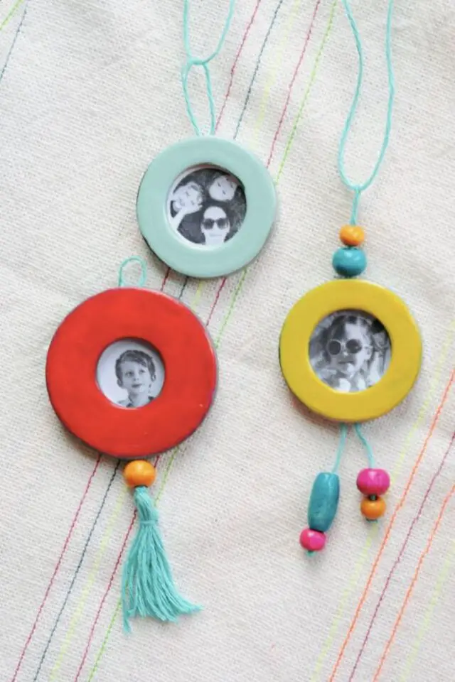 Ca aussi c'est un cadeau que j'aurais été capable de faire. J'aime bien l'idée de travailler la photo pour le cadeau de fête des mères! En plus, il est possible que vous ayez déjà tout ce qu'il faut à la maison: du carton récup' dans lequel vous découperez des ronds, de la peinture pour colorer le carton, un peu de colle, du fil coloré et des petites perles colorées. J'aime la couleur donc j'aime bien cette idée facile à faire qui peut s'accrocher un peu partout dans la maison: poignées de portes, de fenêtres, de meubles...