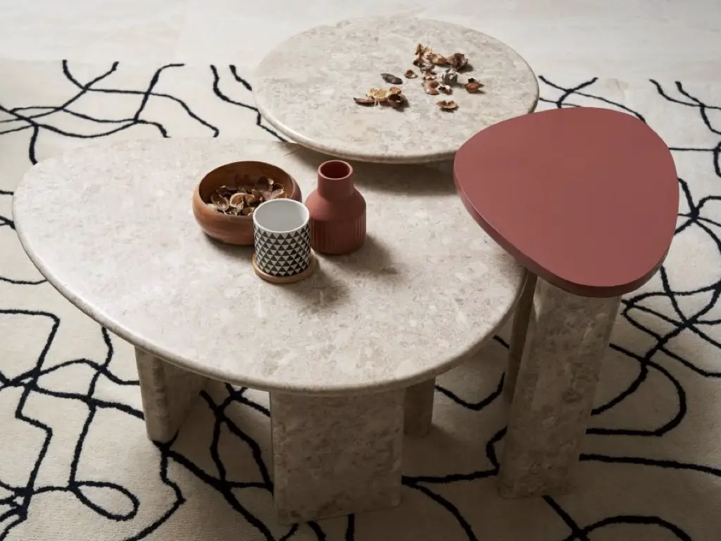 Dans l'illusion de richesse, il y a le marbre qui est utilisé pour le plateau de la table de salle à manger. A la conception de ce meuble, il y avait des chutes qui ont été réutilisées pour créer des tables basses pour le salon.
