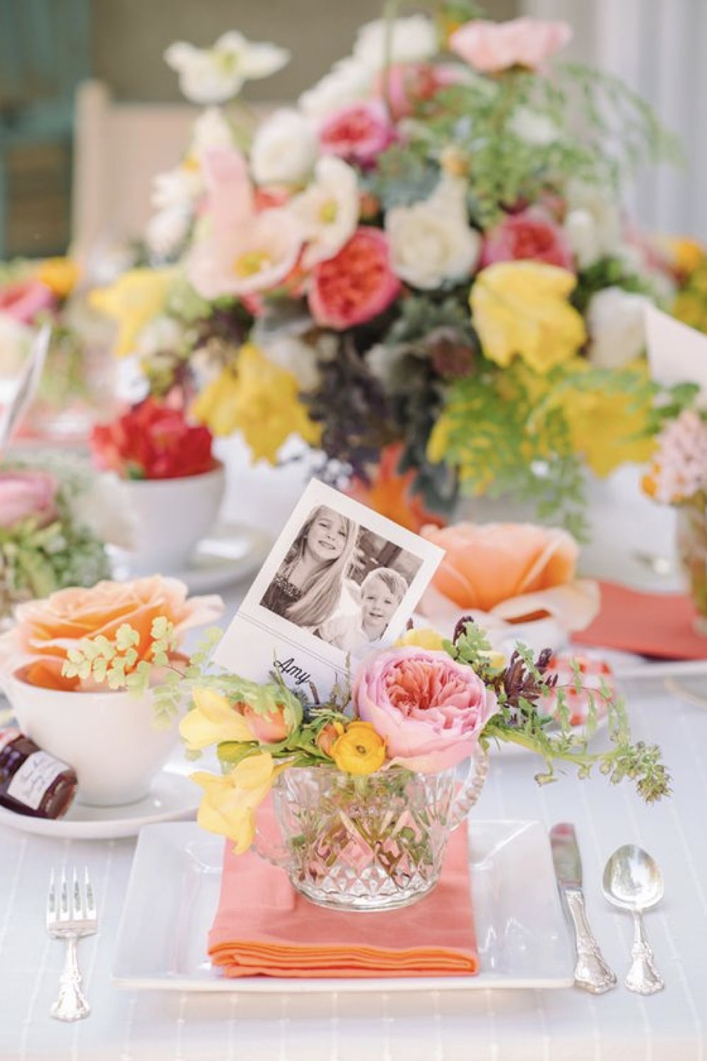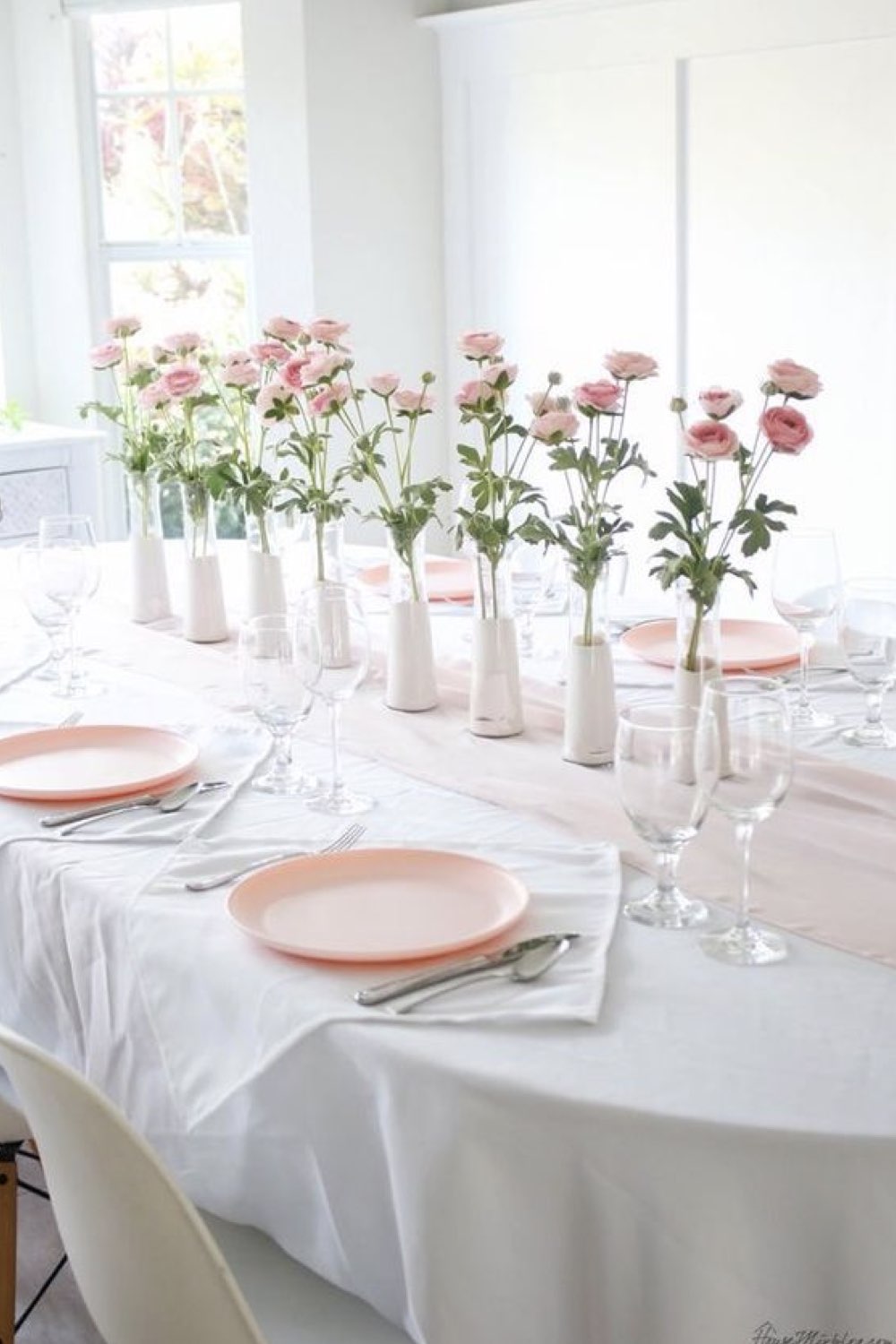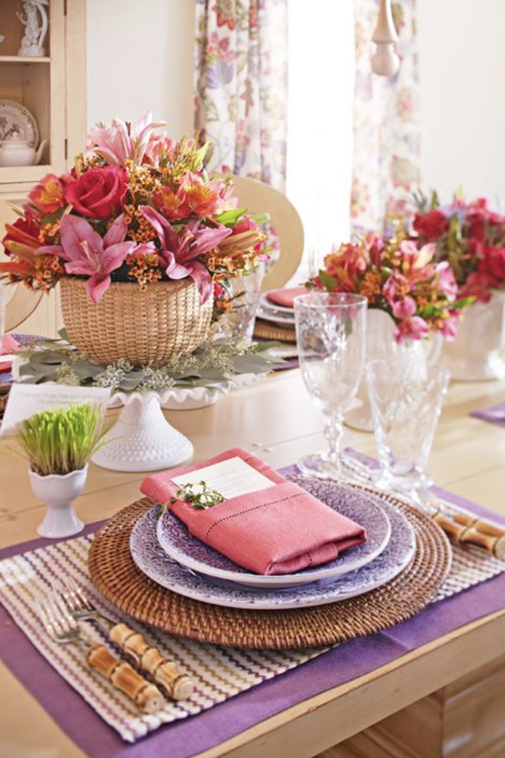 Personnellement, je préfère une association de couleurs un peu plus dynamique: du rose, du jaune, une touche orangée. Je trouve que c'est un peu plus chaleureux et plus vivant. Entre la nappe, le bouquet en centre de table, la vaisselle (et j'en passe), il est assez facile de décliner ce trio de couleurs à table.