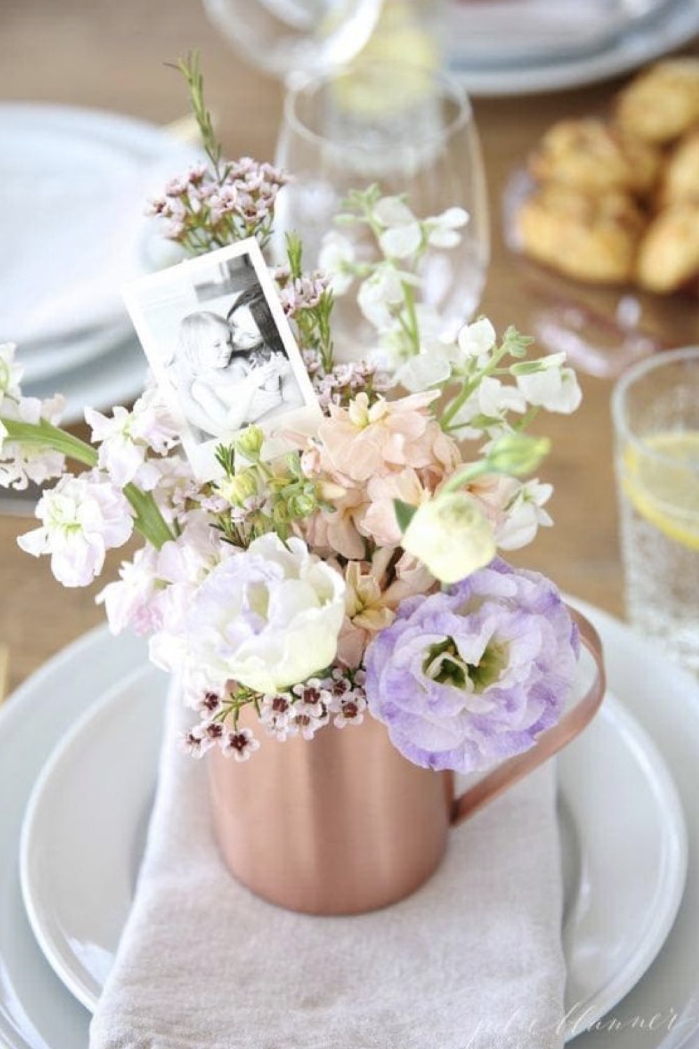 Les fleurs ont toujours une place de choix quand il est question de déco de table. C'est encore plus vrai à la fête des mamans. Pourquoi? Parce que c'est le printemps et ça fait du bien de faire entrer les fleurs dans la maison. Parce qu'on offre souvent des fleurs à cette occasion. Un bouquet - qu'il soit gros ou petit - donnera toujours à votre déco de table un air plus élégant.