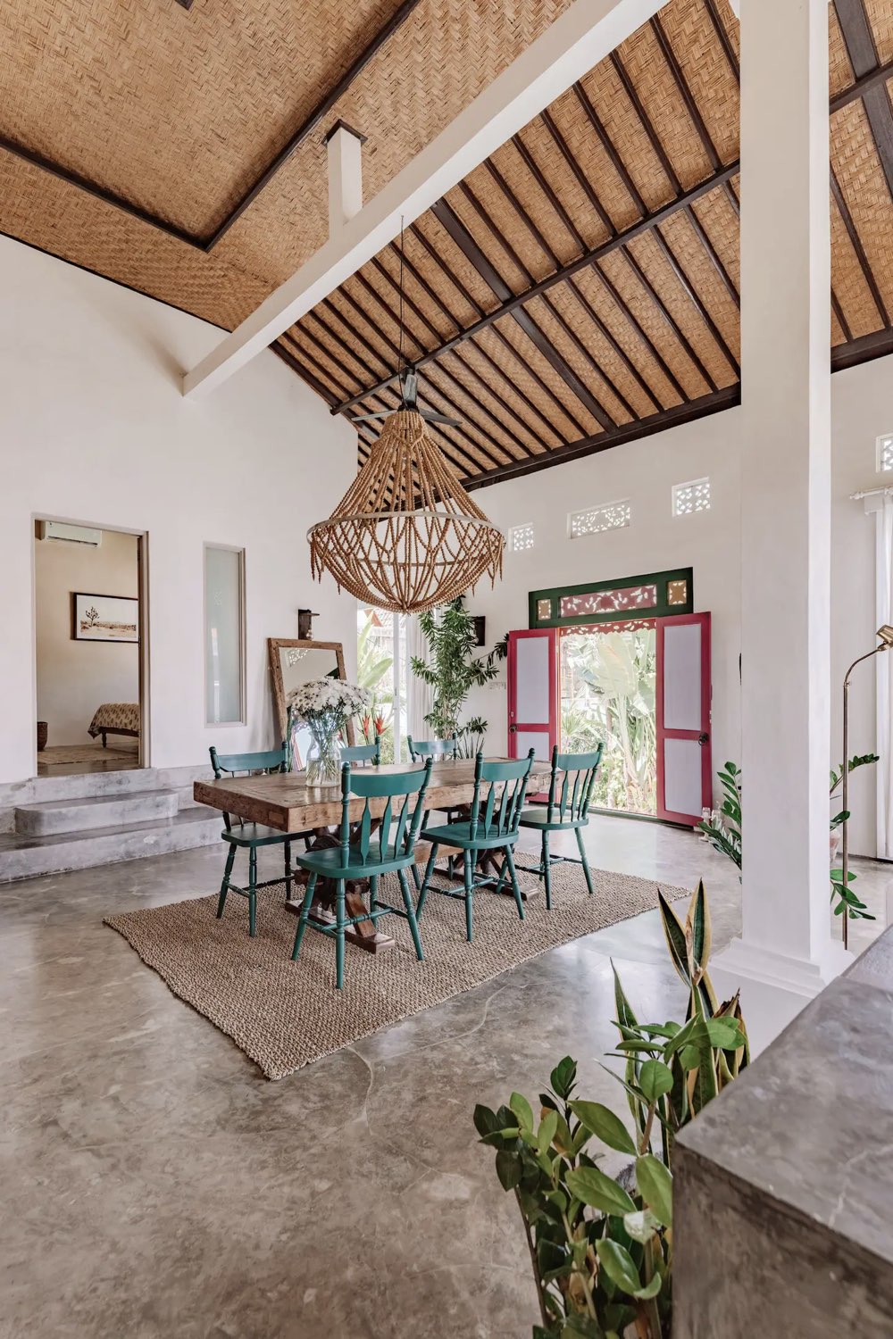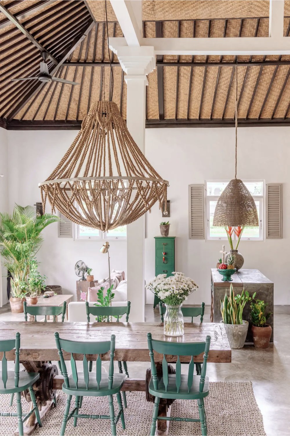 Plus local, on peut regarder le plafond de la grande pièce à vivre ouverte. Il est en feuilles de palmier tressées. Ce revêtement atypique vous fera voyager sans l'ombre d'un doute. C'est un détail typique et local qui est bien plus chaleureux (et léger) qu'un plafond en BA13 classique.