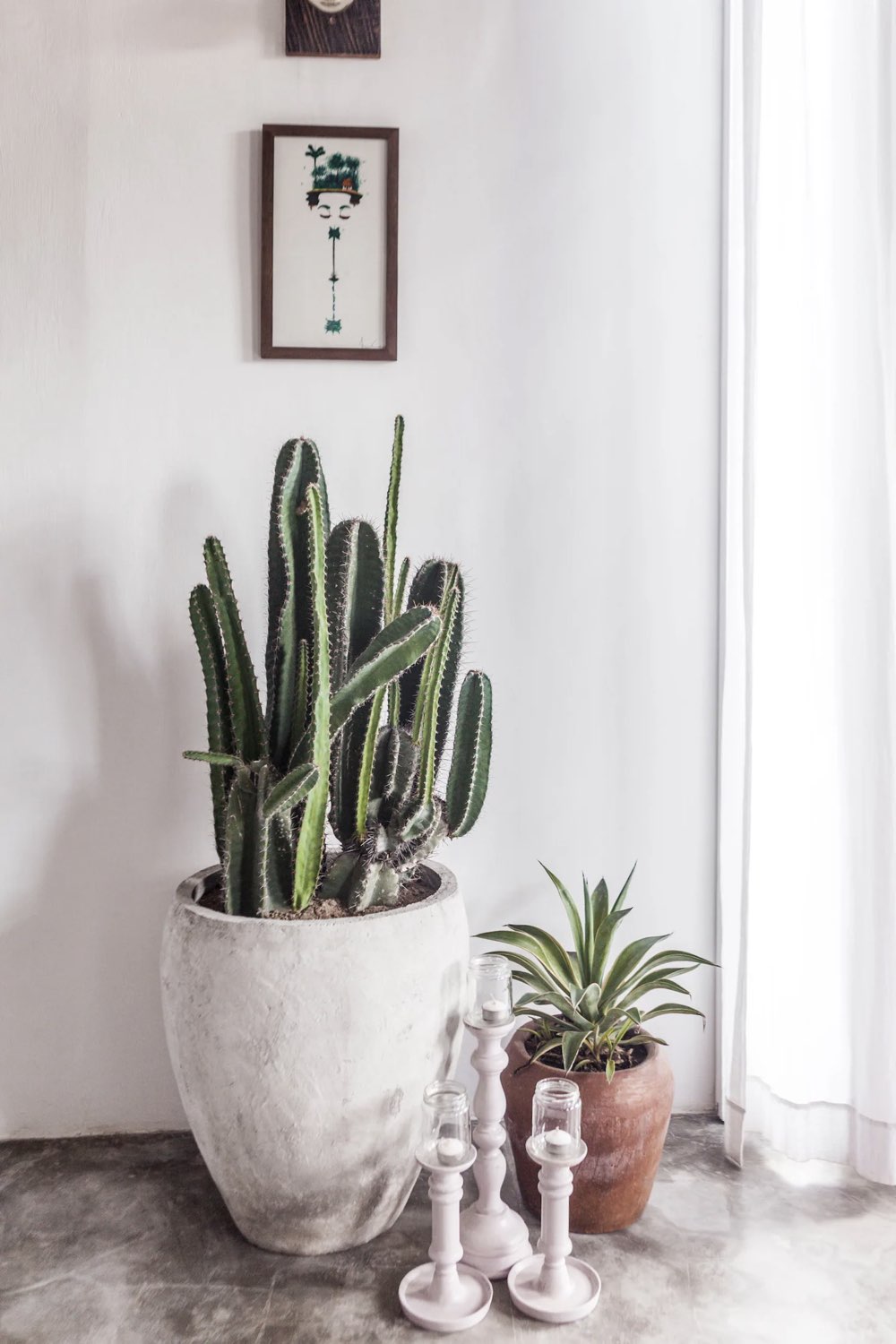 Enfin, il y a les plantes en pot notamment des cactus qui nous font penser au désert, au climat aride (ce qui n'est clairement pas le cas en Asie du sud-est). Le vert des plantes fait écho à quelques éléments de couleur verte dans la pièce de vie: les chaises qui entourent la table de salle à manger, l'assise des tabourets de l'îlot de cuisine, le petit meuble de rangement.