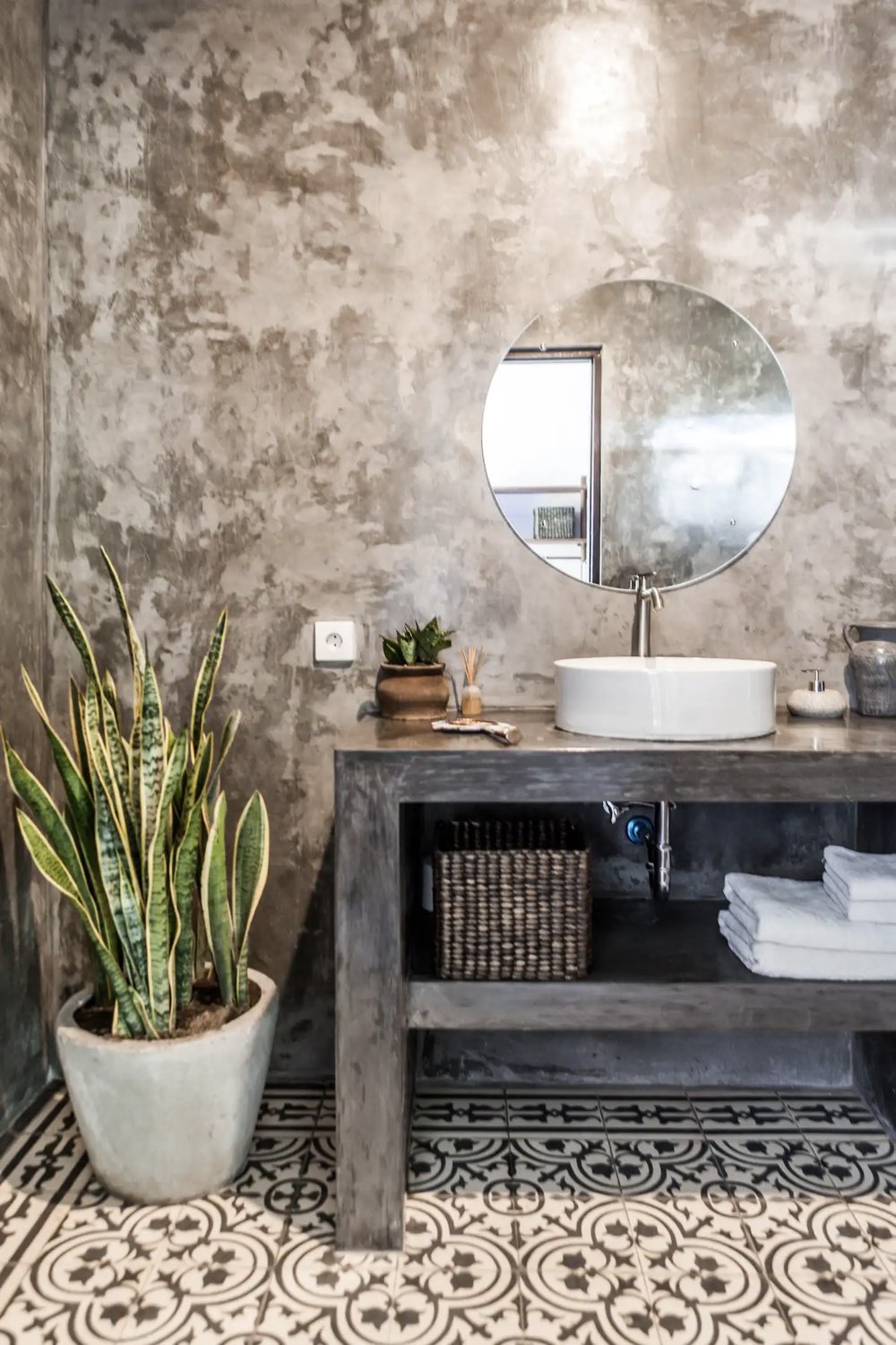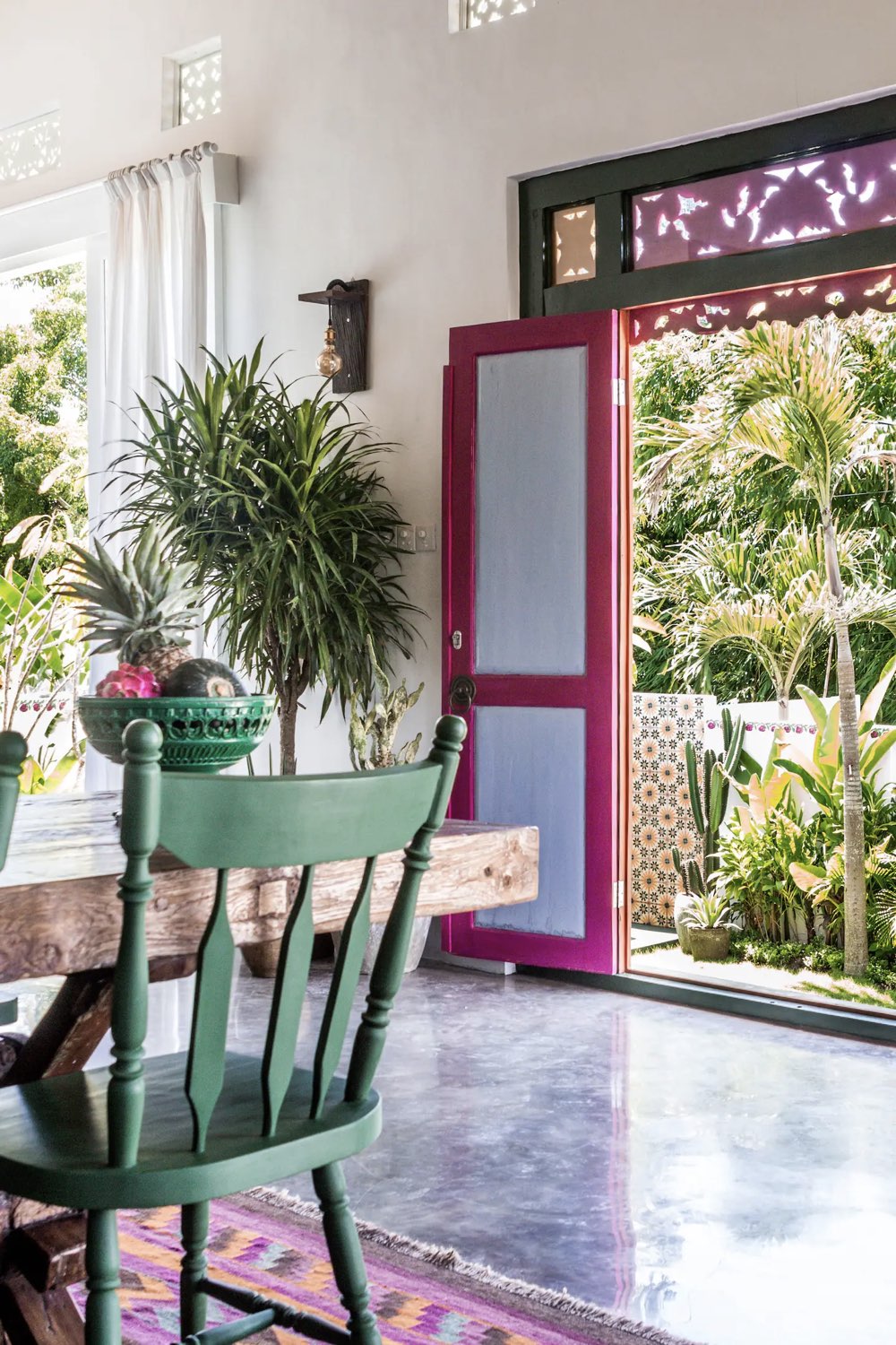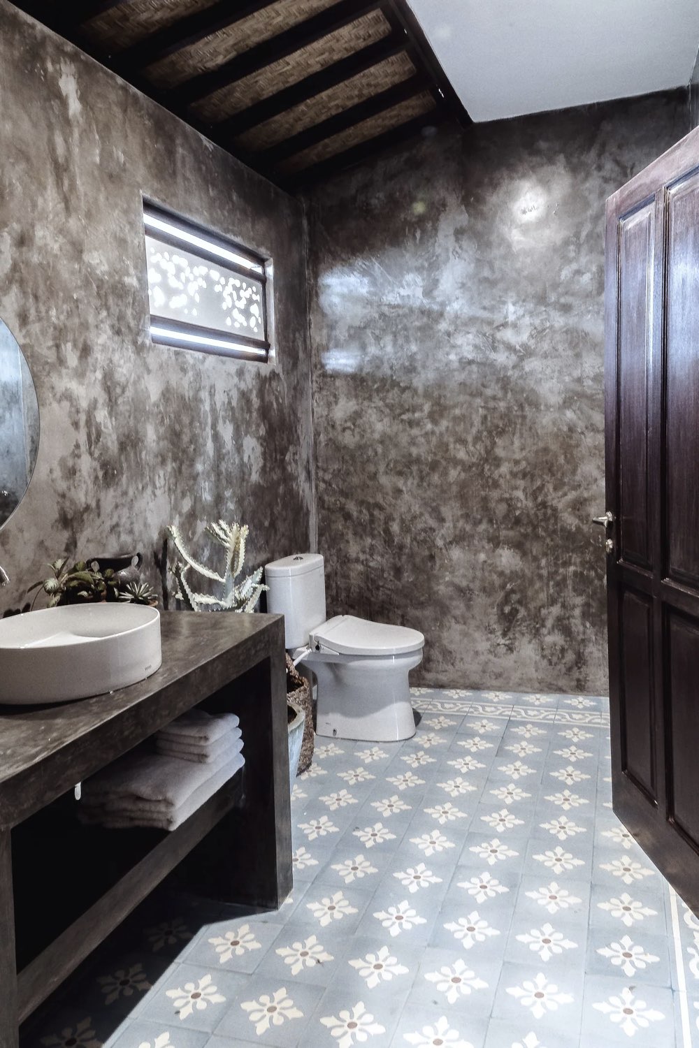 Commençons avec le style mexicain très étonnant puisque la maison est située en Indonésie. Il y a 3 éléments phares qui créent cette ambiance. D'abord, l'omniprésence du béton ciré. Dans la plupart des pièces, il se trouve au sol. Un sol en béton ciré peut créer une atmosphère authentique et simple. On le trouve aussi comme revêtement de meuble pour la cuisine ou comme revêtement mural dans la salle de bain.