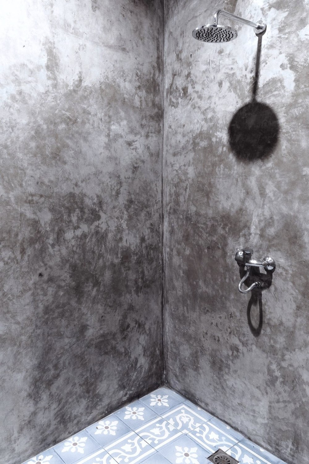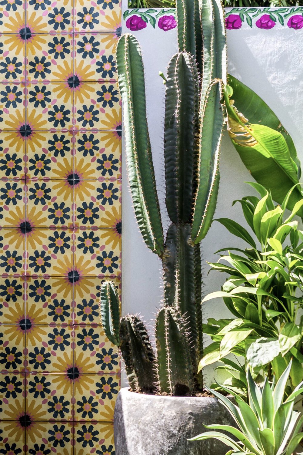 Enfin dernier point plus discret: il y a une douche extérieure dans un coin du jardin. Elle est assez discrête puisqu'elle est entourée de plantes tropicales. Cependant, je suis en amour devant les carreaux de ciment utilisés comme revêtement mural. Le jaune, le bleu, le rose, le motif fleurs / soleil sont simples mais tellement joyeux.