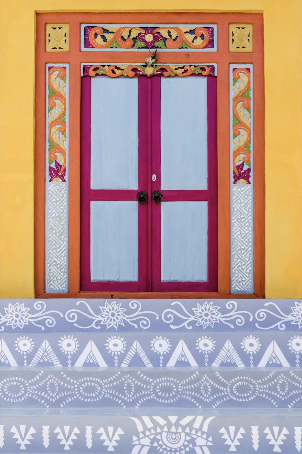 La façade de la maison est jaune soleil, parfaite pour mettre de bonne humeur. Le petit soubassement est dans un gris bleuté plus doux et pour mettre en évidence les marches, des motifs mexicains sont peints en blancs.