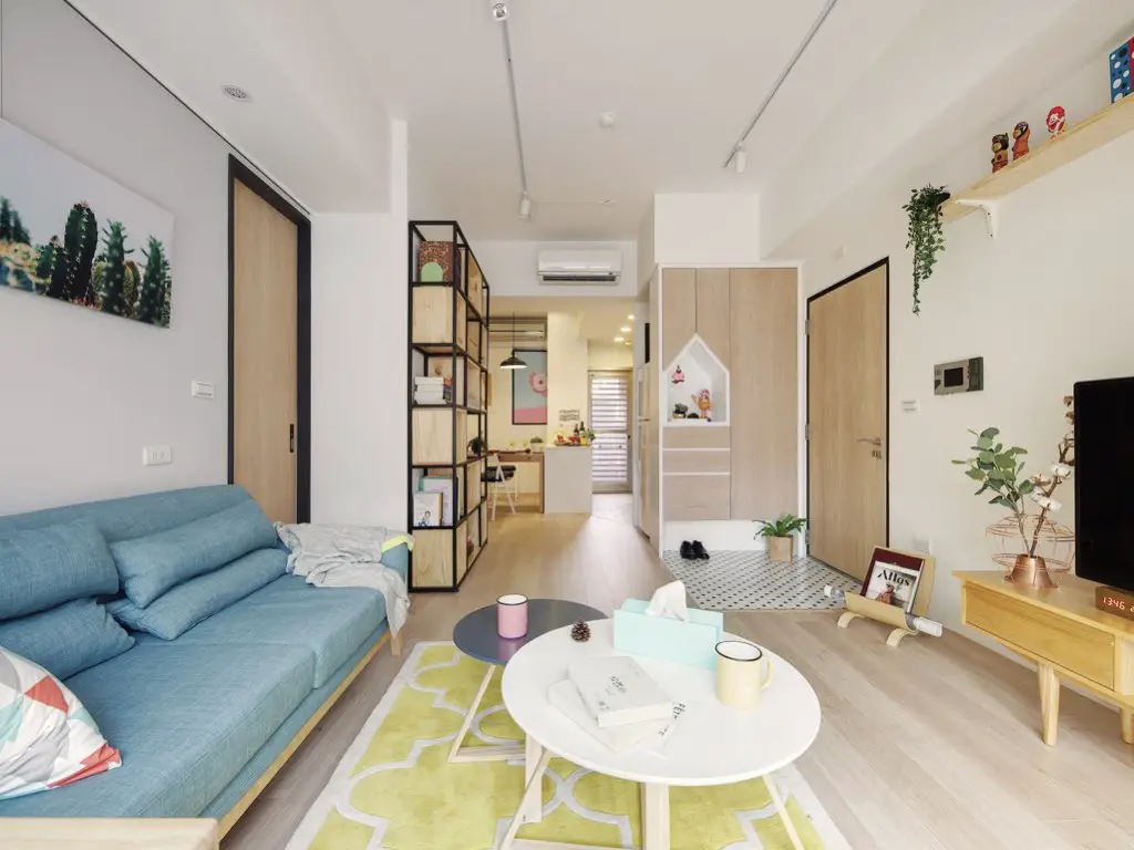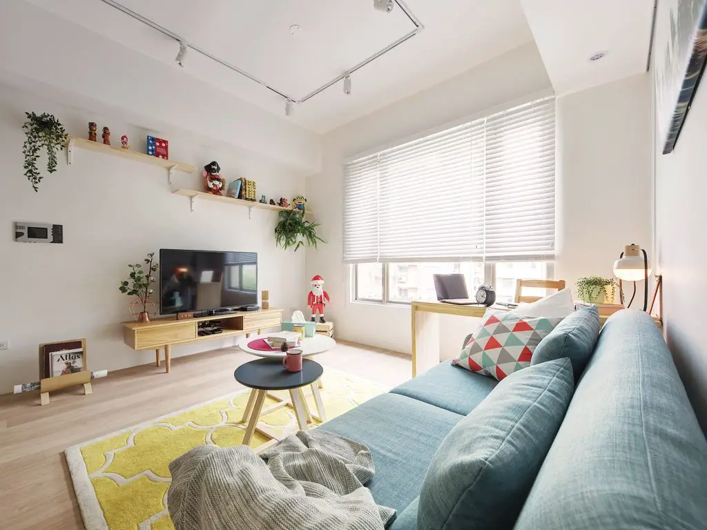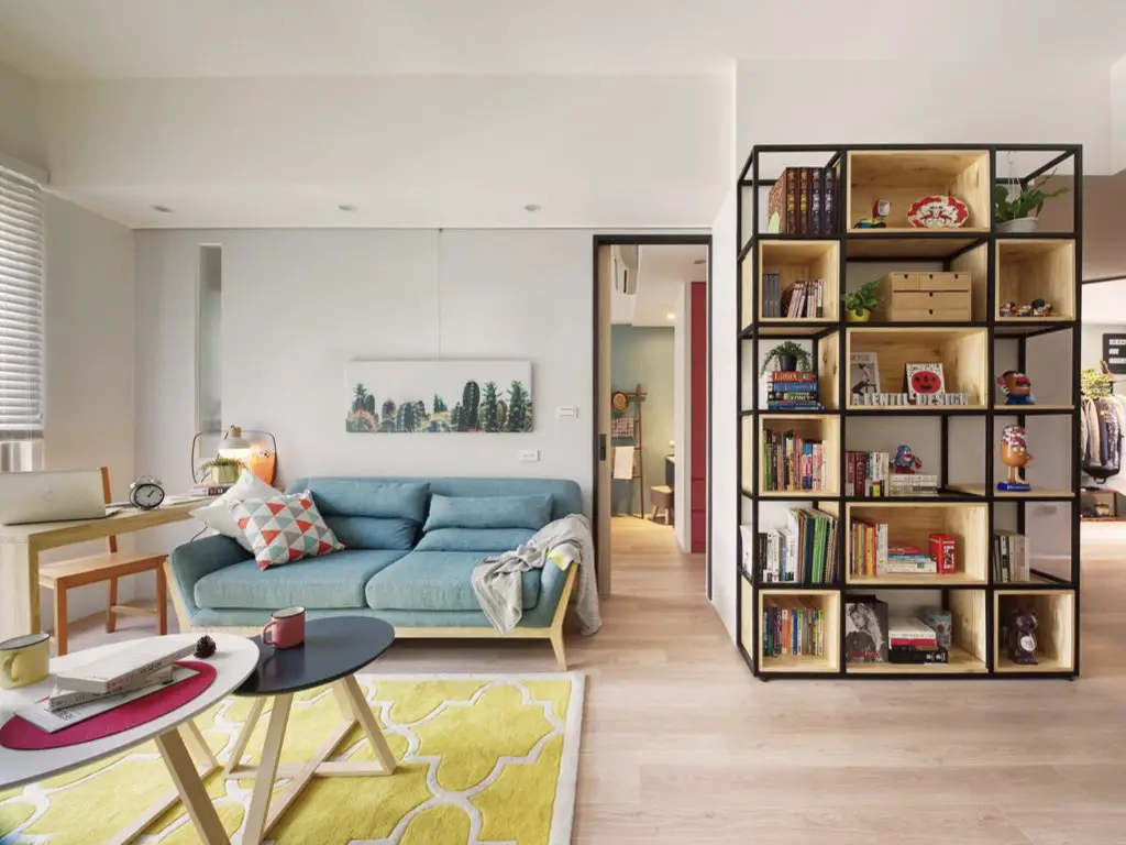 petite maison simple et colorée salon partiellement ouvert tapis jaune et blanc canapé bleu mobilier en bois