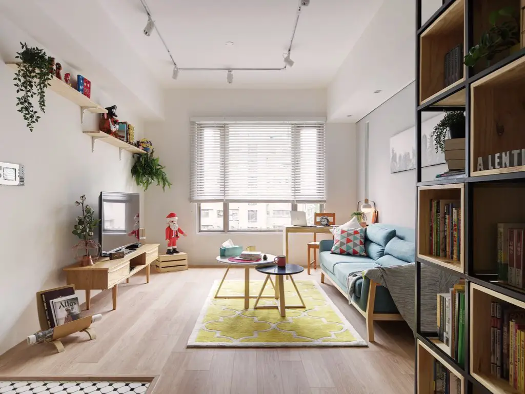 petite maison simple et colorée salon une fenêtre store blanc étagères en hauteur au dessus du meuble TV petit canapé bleu tapis jaune